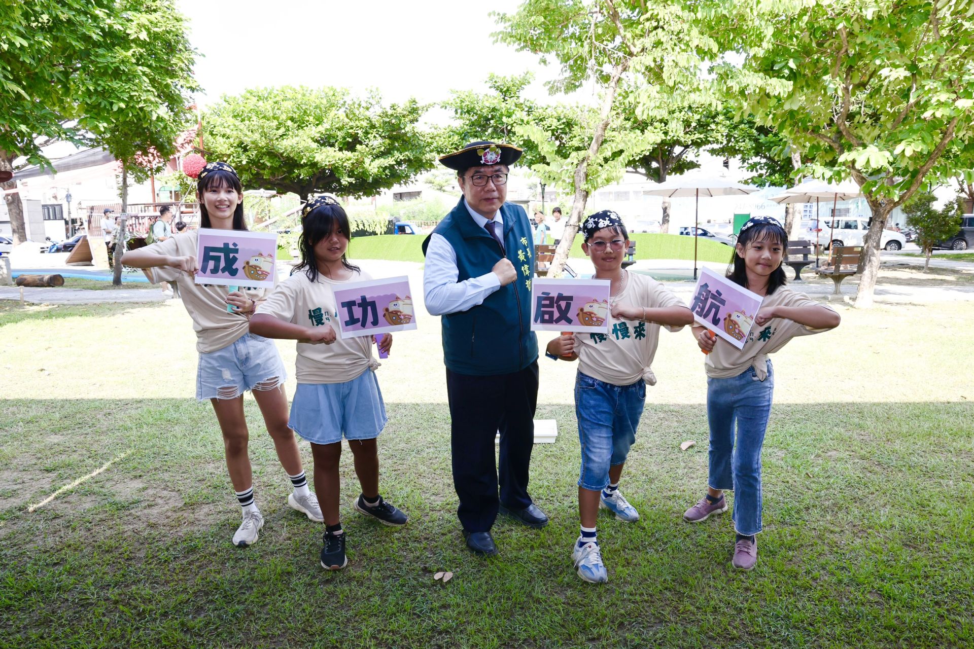 ▲市長黃偉哲戴上「海盜船長帽」,與孩子們一同探索「福安公園-綠谷海盜船」遊戲場各項設施。(新聞處 提供)