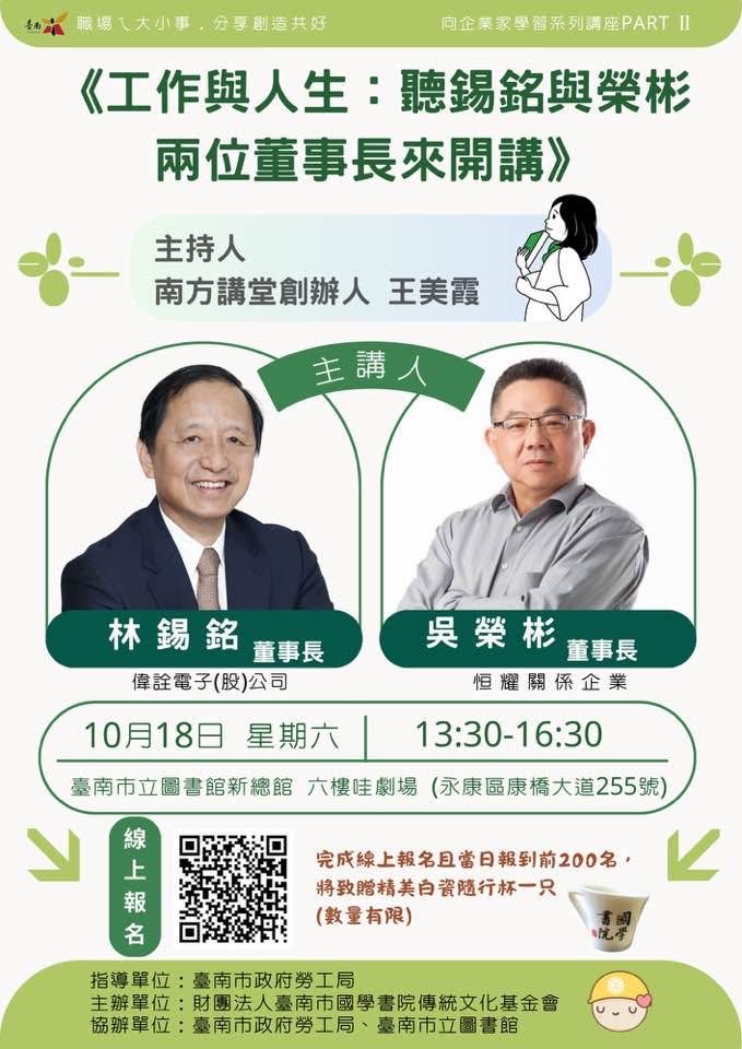 為落實市長黃偉哲「希望家園」的施政願景,積極營造良好的學習風氣,強化勞工教育,進而充實市民生活智慧與提升人文素養,由財團法人臺南市國學書院傳統文化基金會主辦,臺南市政府勞工局及臺南市立圖書館協辦,將於10月18日(週六)下午1點30分至4點30分在臺南市立圖書館新總館6樓哇劇場舉辦「職場乀大小事,分享創造共好──《工作與人生:聽錫銘與榮彬兩位董事長來開講》」講座。本次講座邀請兩位重量級企業董事長─半導體業界重要元老級人物偉詮電子股份有限公司林錫銘董事長,及隱形冠軍恒耀工業股份有限公司吳榮彬董事長同台對談,從職場經驗到人生智慧,帶領大家探索如何在工作中實踐共好,並在生活裡找到價值與方向。