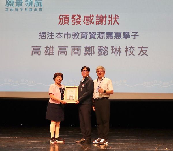 陳其邁市長也特別頒贈感謝狀予高雄高商校友鄭懿琳女士,以及八方雲集國際股份有限公司,表彰他們對高雄市學生與學校的資源挹注。高雄高商校友鄭懿琳女士捐贈新台幣壹仟萬元回饋母校,以優化學校學習環境並嘉惠學弟妹優質表現。八方雲集國際股份有限公司則積極關懷偏鄉教育,為厚植學偏鄉學子閱讀量能,特捐贈新臺幣100萬元挹注「偏鄉智慧閱讀公益計畫」採購10台AI智慧閱讀機,期透過AI智慧科技的導入,讓閱讀走入孩子生活,豐富多元學習體驗。