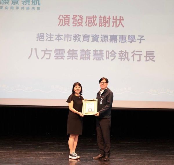 圖3:陳其邁市長頒贈感謝狀予八方雲集國際股份有限公司,關懷偏鄉教育,為厚植學偏鄉學子閱讀量能,捐贈新臺幣100萬元挹注「偏鄉智慧閱讀公益計畫」採購10台AI智慧閱讀機,透過AI智慧科技的導入,讓閱讀走入孩子生活,豐富多元學習體驗。
