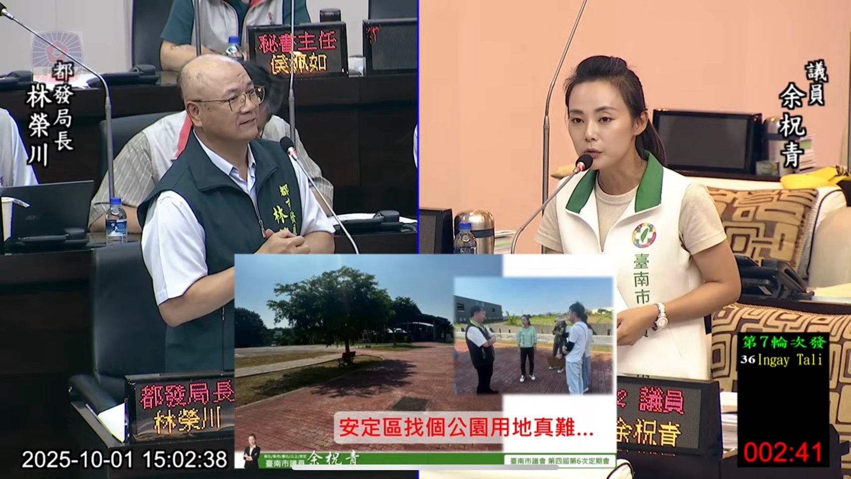 另外,市議員余柷青也關心安定區的發展。她表示,自縣市合併後,除南科土地重劃有明顯進展,其餘生活圈幾乎沒有政策推動,因此她積極尋找適合安定的「特色主題公園」。然而,因土地使用地目之限制,會勘過程屢屢受阻。經評估後,最理想腹地位於安定的複合式運動公園,但現為殯葬用地。余柷青與都發局積極溝通下,後續將建請安定區公所擬定興辦事業計畫,並送地政局辦理非都市土地變更(2公頃以下),將殯葬用地轉為特定目的事業用地,讓安定特色公園有望成真,另在南科特定區D區未來也預計規劃公園用地可打造特色公園,落實市府一區一特色公園的政策執行。