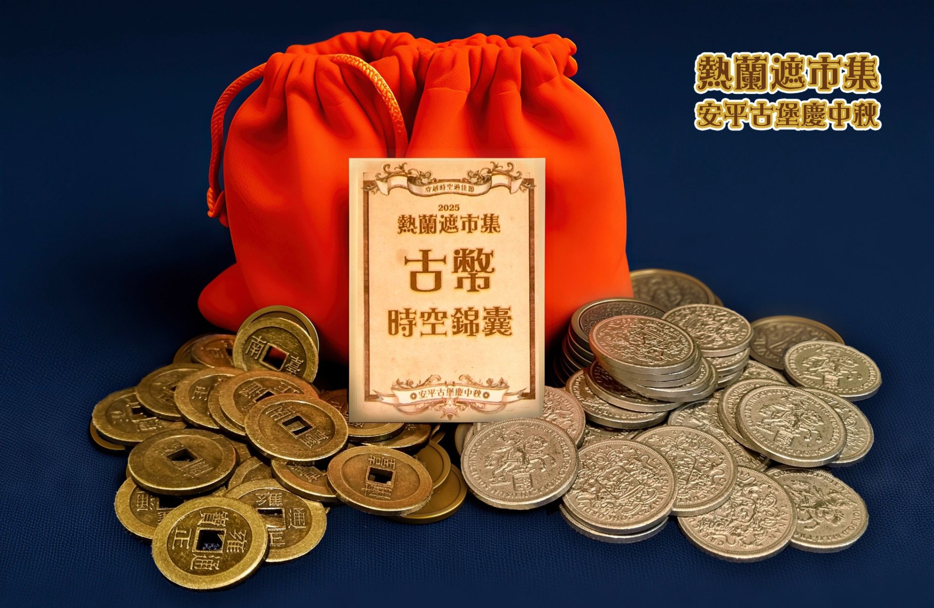 熱蘭遮市集最受矚目的周邊商品就是特製古幣。今年適逢臺灣府城建城300年,推出三款升級版收藏幣,並以橘色「古幣小錦囊」整袋販售,象徵熱蘭遮堡最初名稱「奧倫治城(Oranje)」。其中「雍正通寶」為首次發行,原本背面的發行地註記改為「臺南」,單枚面值10元;「荷蘭馬劍銀幣」正面為騎士圖案,背面加刻「TAINAN」字樣,單枚面值50元;「螺錢」則以原住民族貝貨為原型,造型圓潤,單枚面值100元。三款古幣不僅能作為市集代幣,也是紀念收藏佳品。