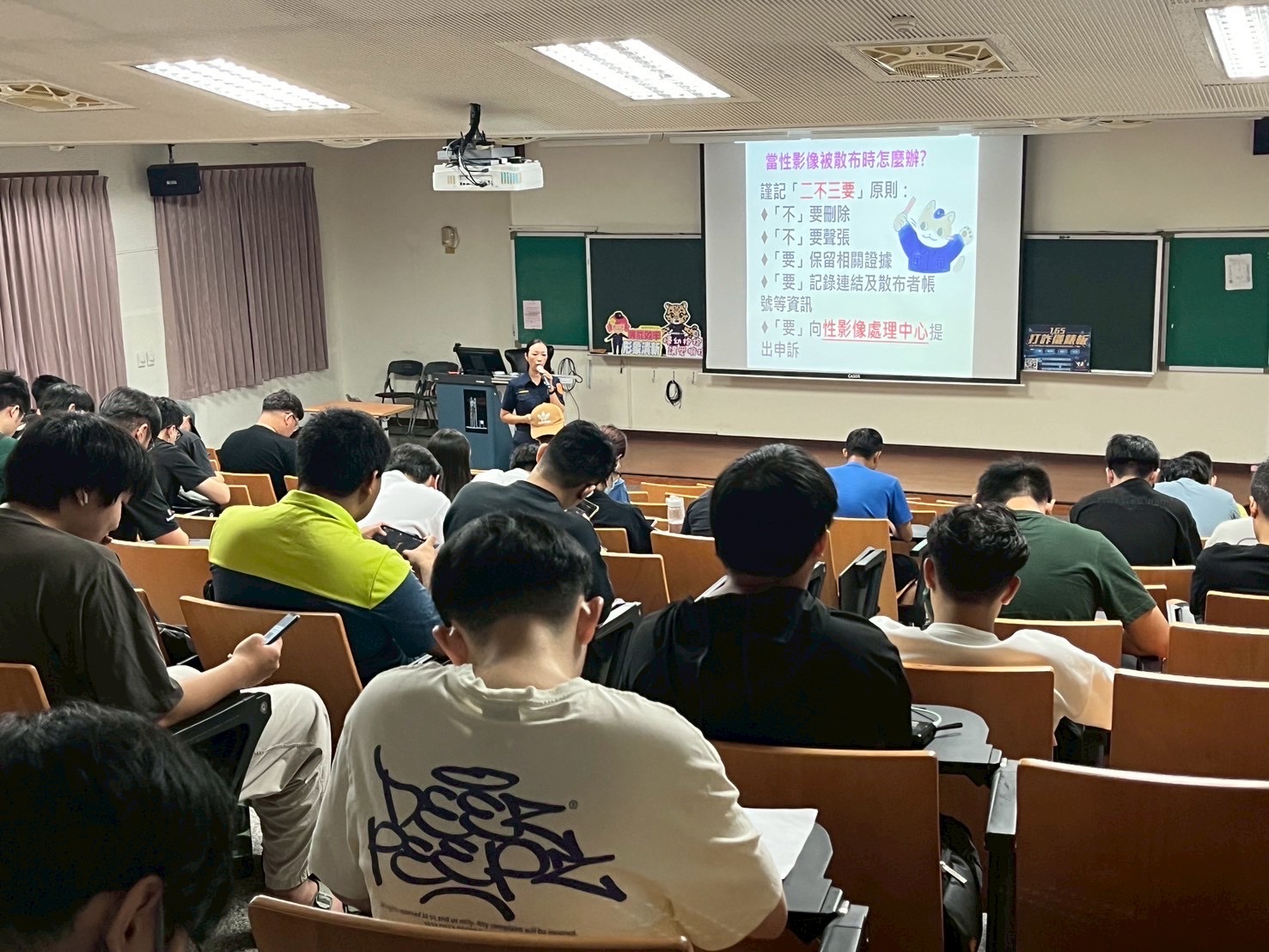 臺南市政府警察局婦幼警察隊於中秋假期前夕至本市多所學校針對婦幼人身安全、反詐騙及秋節廉政等議題宣導。 近年網路科技資訊發展,性影像犯罪案件及網路詐騙案件增多,南警婦幼宣導團於課堂中加強宣導「性影像防制」觀念,應謹記「二不三要」原則:「不」要刪除、「不」要聲張、「要」保留相關證據、「要」記錄連結及散布者帳號等資訊、「要」向《性影像處理中心》提出申訴。