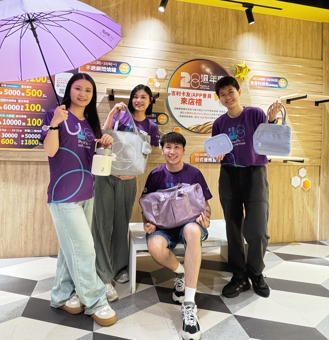 除了消費滿額贈獎外,週週推出卡友禮已成為屏東太平洋百貨的特色之一,今年百貨公司以優雅粉紫色調設計一系列週年慶限定卡友來店禮,從預購開始共計五波,卡友/會員於各活動檔期持吉利卡或出示APP會員條碼+本館/二館當日消費累計滿1000元(含)以上之同卡號發票,即可加價現金兌換乙份(不累贈),第一波10/2(四)~10/6(一)中秋節連假檔期加價現金100元兌換【不銹鋼悶燒罐1100ml】、第二波10/9(四)~10/12(日)雙十連假檔期加價現金80元兌換【大容量肩背手提旅行袋】、第三波10/16(四)~10/19(日)加價現金80元兌換【日式優雅16骨傘架直傘】、第四波10/23(四)~10/26(日)免費兌換【肩背托特包(附零錢包)】、第五波10/30(四)~11/3(一)加價現金80元兌換【玻璃保鮮盒提袋組】,精選時尚且實用卡友禮,等您來蒐集。