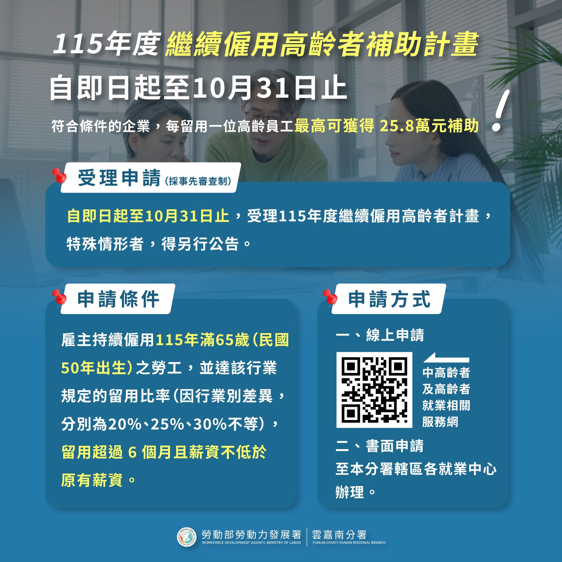 臺灣已邁入超高齡社會,勞動力供給面臨結構性壓力,為鼓勵企業持續僱用屆齡在職勞工,協助其延緩退休、傳承職場智慧與技術,勞動部勞動力發展署雲嘉南分署推動「繼續僱用高齡者補助計畫」,115年度申請受理時間自即日起至10月31日止,南分署提醒符合條件的企業踴躍把握機會,每留用一名滿65歲員工,最高可獲補助新臺幣25萬8,000元。