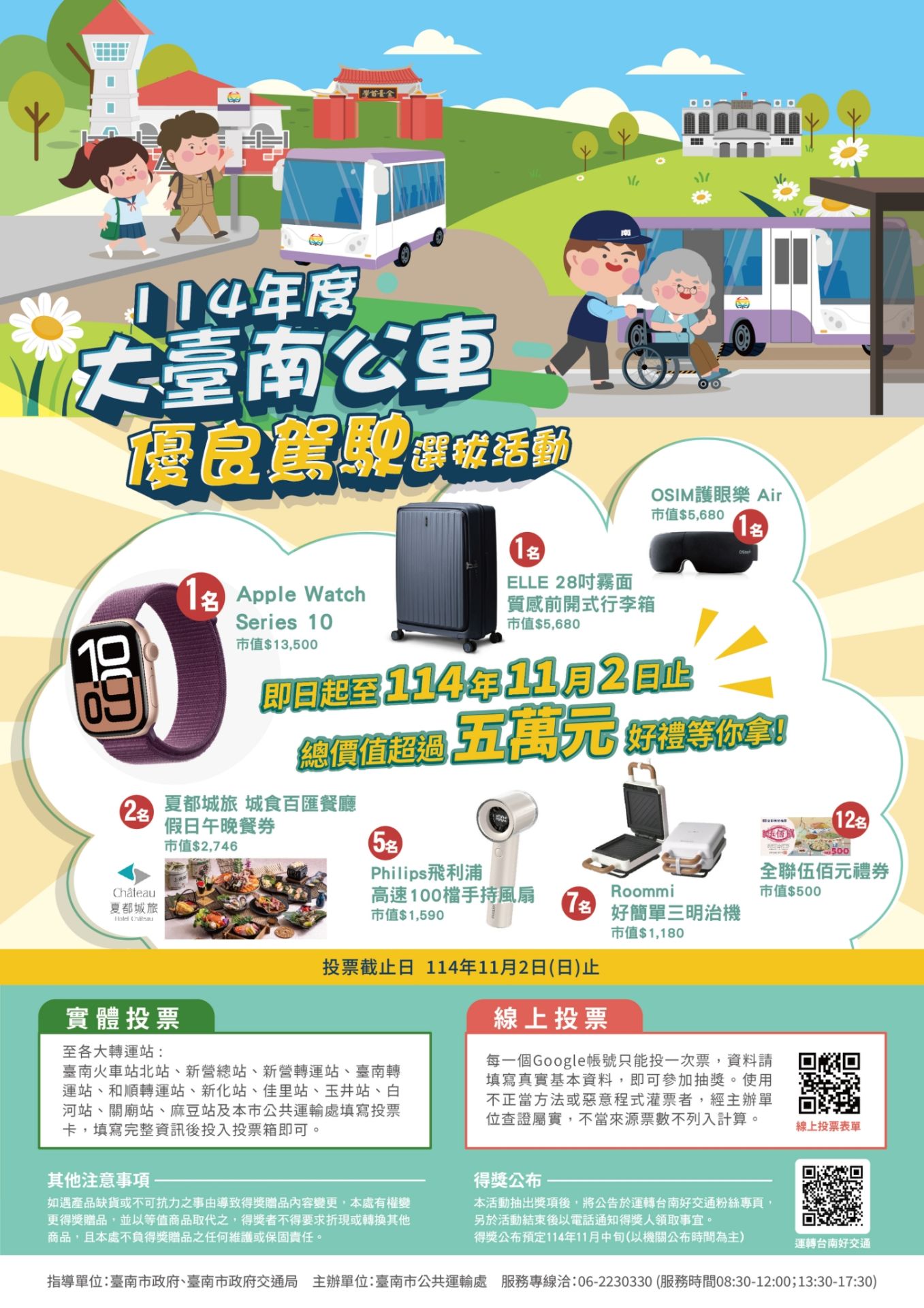 大台南公車一年一度優良駕駛票選活動正式展開!臺南市政府交通局誠摯邀請市民朋友共襄盛舉,即日起至11月2日止,只要為您心目中的優良駕駛投下寶貴的一票,就有機會抽中最大獎 Apple Watch Series 10及多項好禮,趕快行動吧!