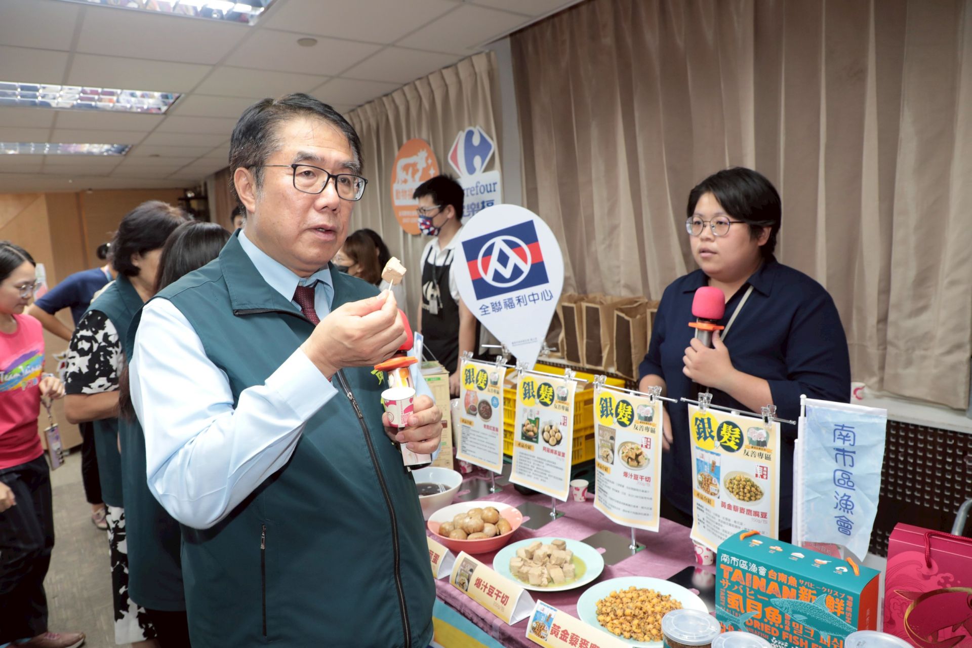 ▲「銀髮友善 通路無礙」記者會,市長黃偉哲試吃爆汁豆干。(新聞處 提供)