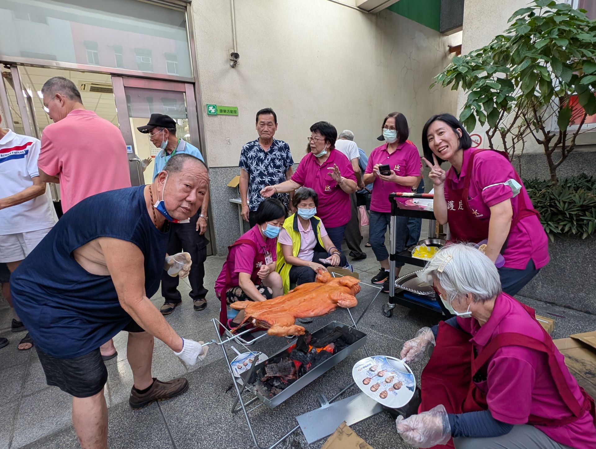 ▲饒伯伯挑起烤乳豬重任(左一)。(圖/板橋榮家提供)
