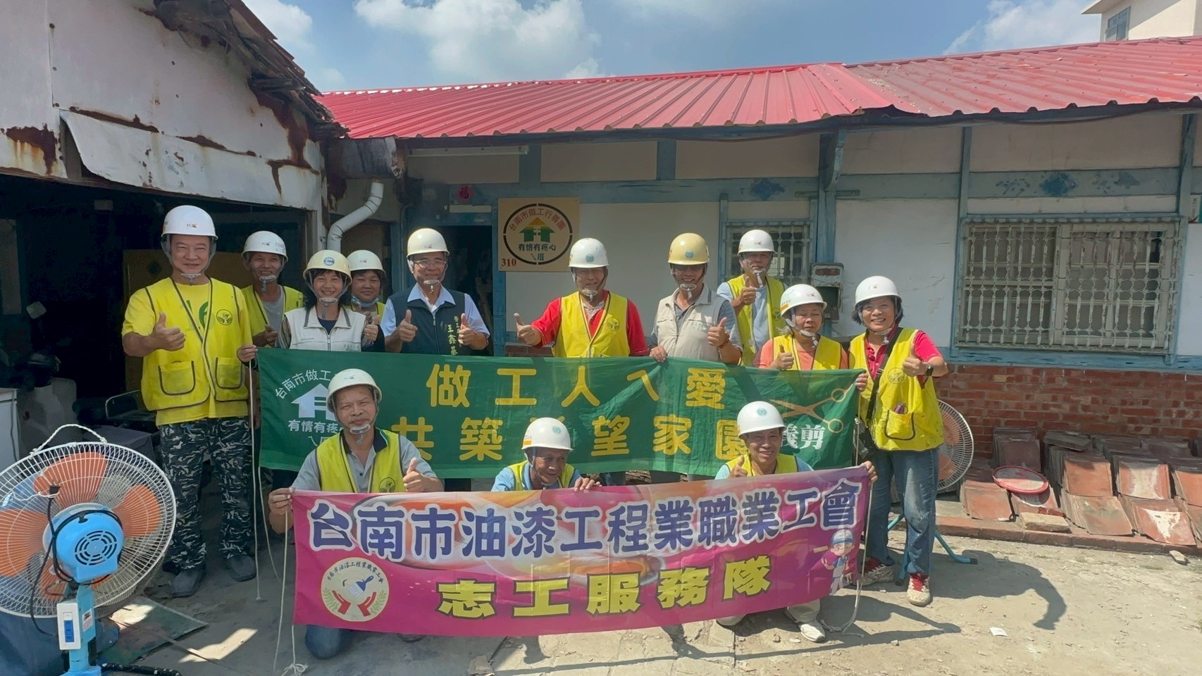 臺南市勞工局「做工行善團」持續三週連假都未曾停歇,這週在雙十連假國慶氛圍中,泥水工會及台南市安衛家族新舜營造團隊於10/10國慶日分別前往後壁區菁寮後廍及關廟區進行修繕,今日(10/12)油漆工會接棒出帆,前往後壁區上茄苳進行修繕並達成最後完工階段,讓老屋重獲新生,亦迎來案主陽光般的開心笑容。這是做工行善團第310戶愛心修繕義舉,也是市長黃偉哲任內完成的第229戶,落實市長黃偉哲最暖心的施政理念「希望家園」,緊接著台南市安衛家族成員連景企業有限公司,明日(10/13)也將前往後壁協助搭設鷹架提供志工安全修繕環境,為府城弱勢族群一步一腳印地築夢踏實。