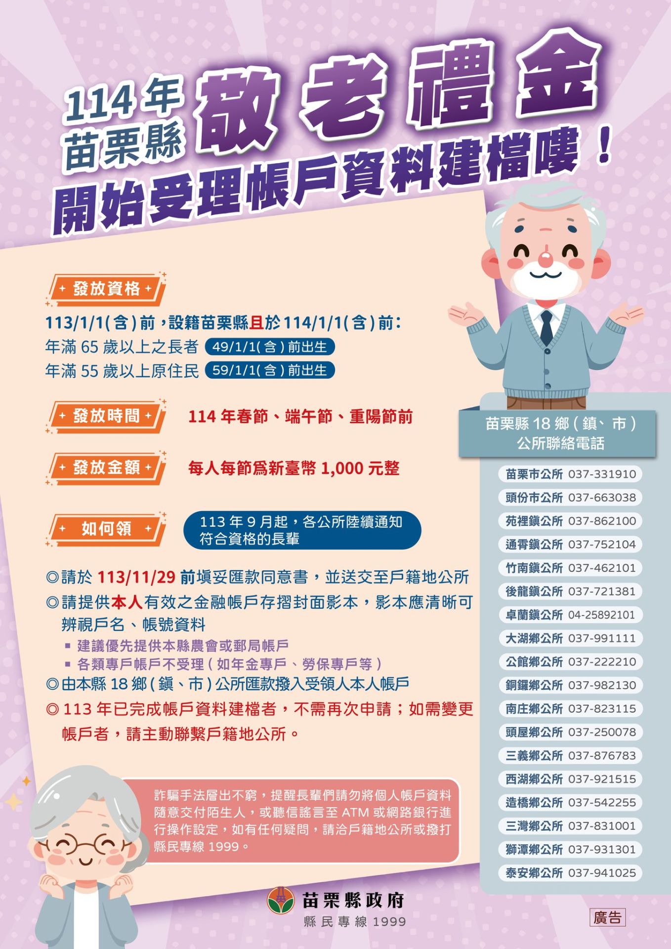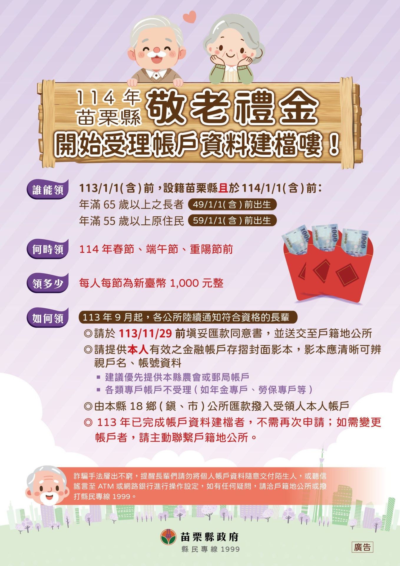 苗栗市公所提醒,敬老禮金申領全程免費,切勿聽信來電或簡訊要求提供金融帳號或提款操作,避免遭詐騙。如有疑問,可洽苗栗市公所或撥打縣民專線1999洽詢。