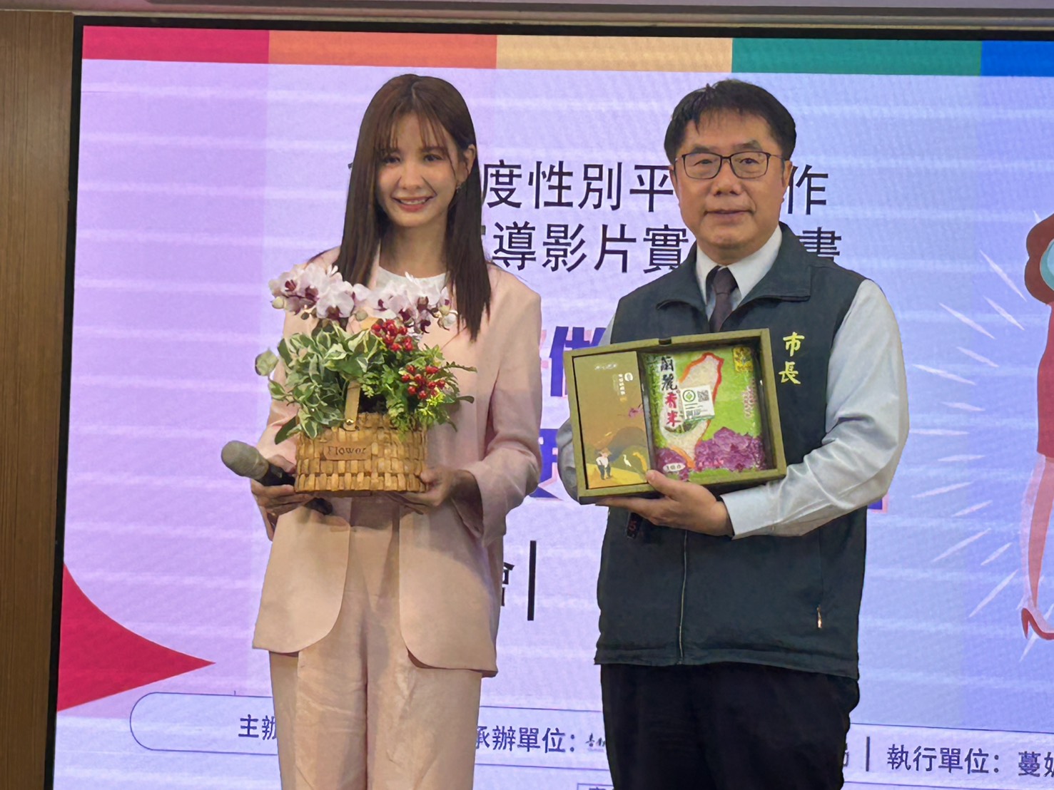 ▲市長黃偉哲攜手藝人安心亞共同倡導性別平權之重要性。(記者黃雋淮 攝)