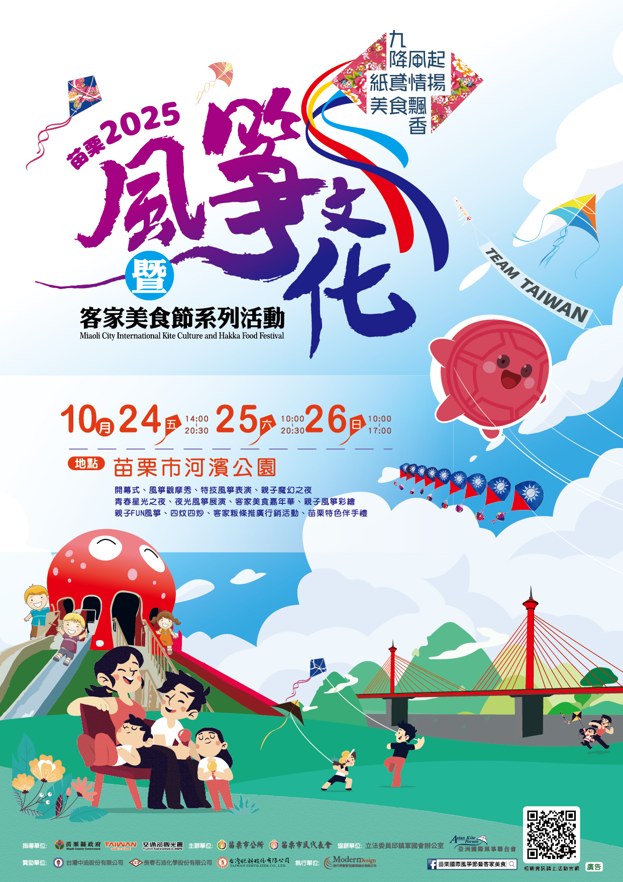 余文忠市長表示,苗栗風箏文化暨客家美食節不僅是放風箏的節慶,更是連結文化、歷史與人情的年度盛事。「當紅粄象徵幸福,國旗代表榮耀,TEAM TAIWAN凝聚團結,這三者在天空中交織飛舞,就是苗栗最美的風景。」苗栗2025風箏文化暨客家美食節,邀請全台民眾一同來到苗栗,迎風放飛夢想、品味客家風光,讓幸福隨九降風漫延全台。活動詳情請上官方網站查詢:http://www.miaoli-9kite.com/。