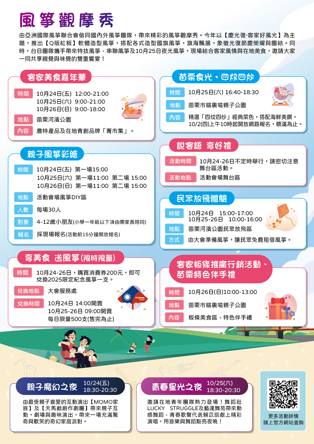 活動期間安排多元互動,包括親子免費放飛體驗、風箏DIY、講客語送好禮及免費接駁車服務,讓全齡族群都能輕鬆參與。此外,10月24、25日晚間將分別舉辦「親子魔幻之夜」與「青春星光之夜」兩場主題晚會,邀請深受小朋友喜愛的【MOMO家族】與專業表演團隊登台,以魔術、劇場與音樂打造最繽紛的家庭之夜;同時也邀請在地青年團隊熱力演出,包括熱音社、街舞團體等,以滿滿的創意與能量展現苗栗青年的青春活力。