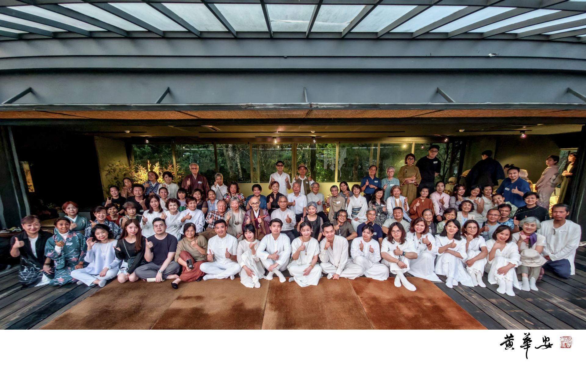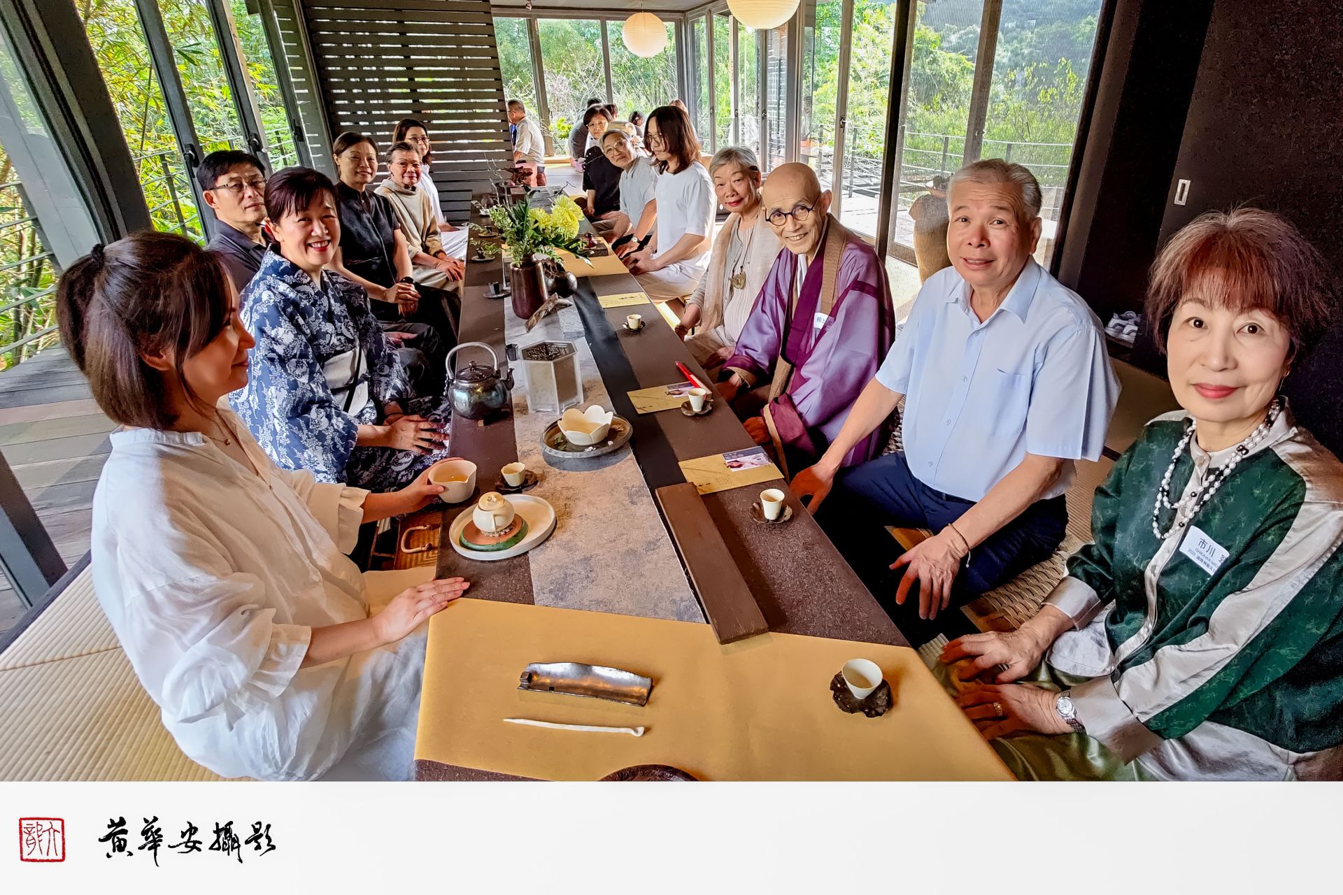 台日與會藝術家於茶屋前合影留念,笑容與山林共融,禪藝精神由此傳遞。(圖/記者黃華安攝)