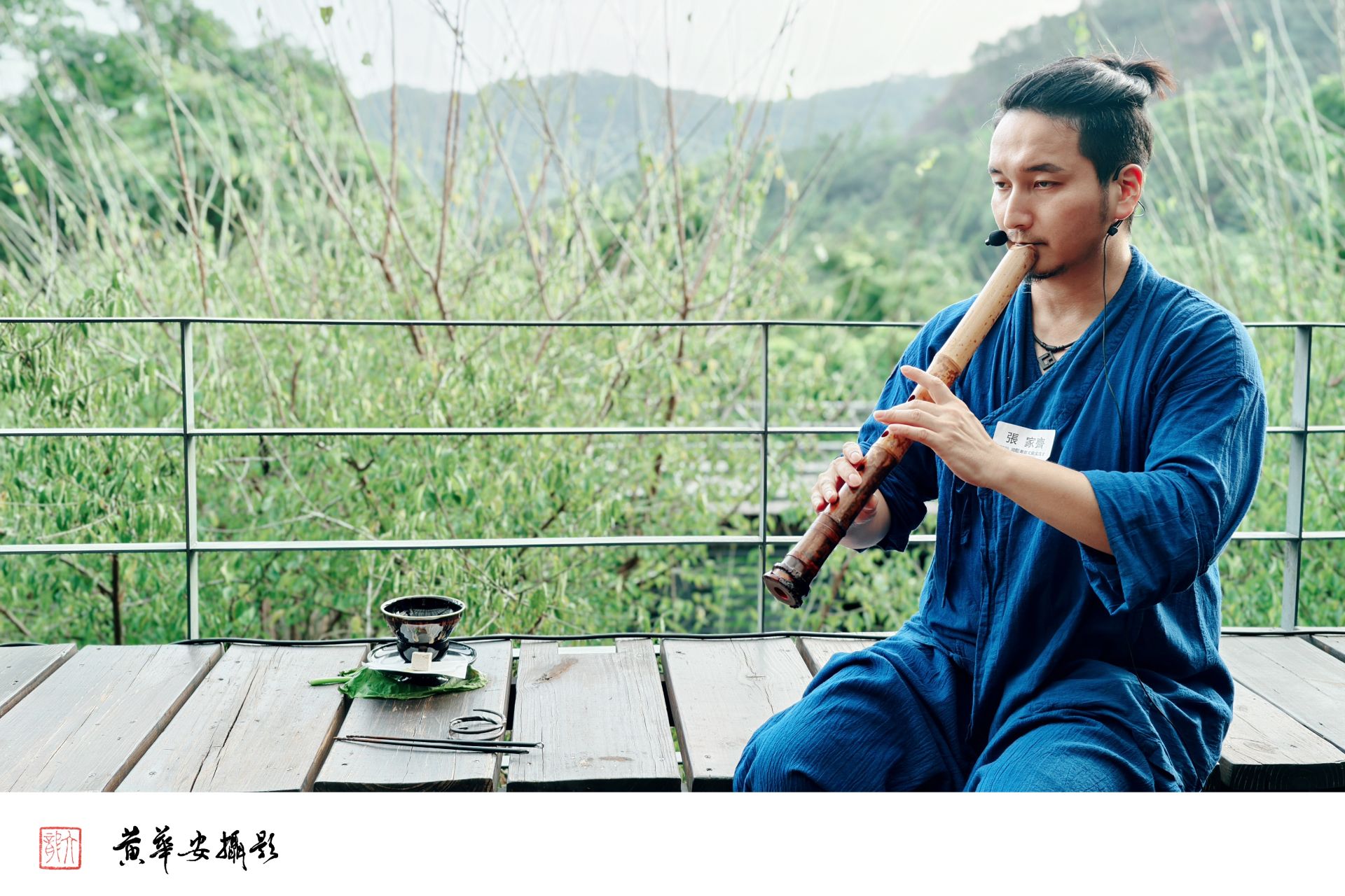尺八演奏家張家齊神情專注,尺八音色悠然飄蕩於山林,氣息化為風的節奏。(圖/記者黃華安攝)
