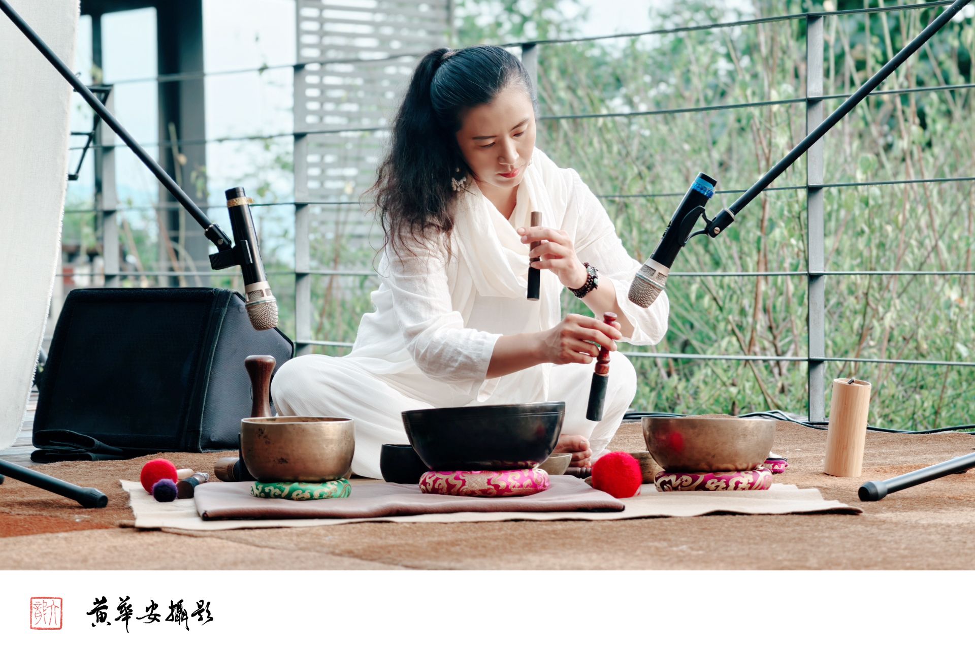 頌缽音療演奏家蕭盈擊缽而坐,聲波一圈圈擴散,如水中月影,靜謐而深遠。(圖/記者黃華安攝)