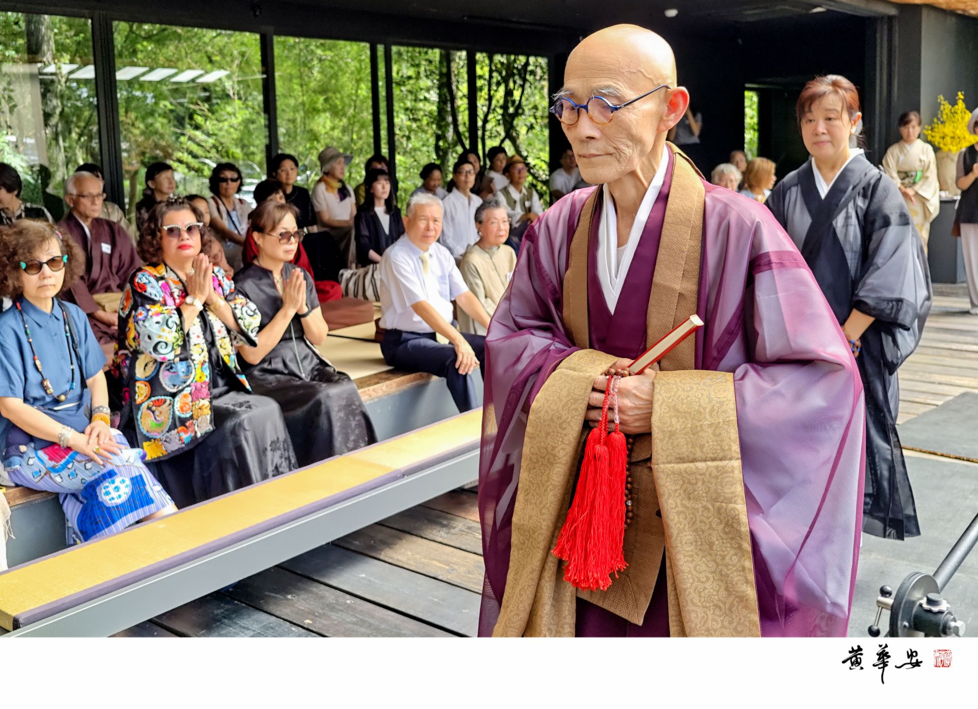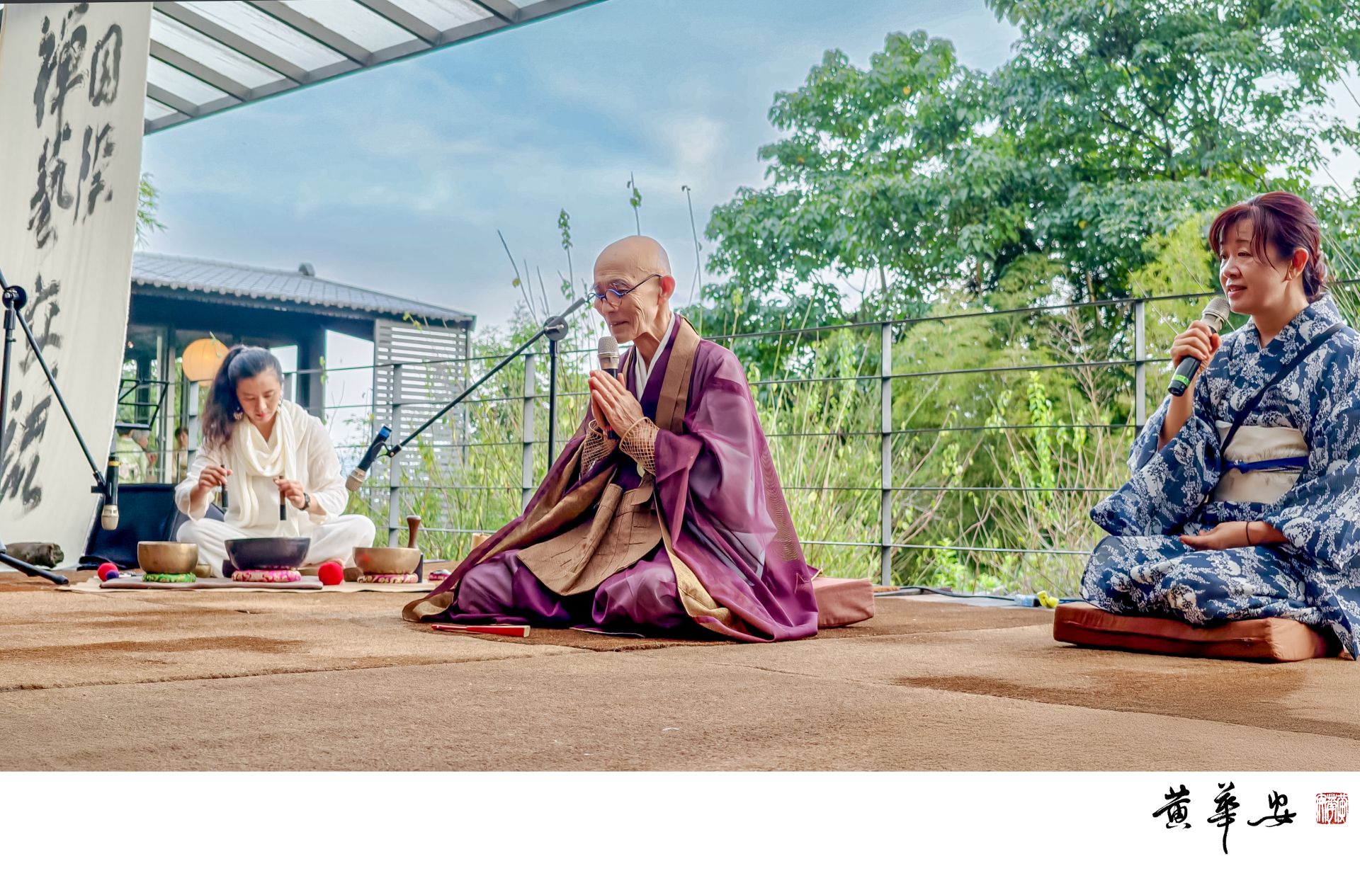 活動由陳國寧老師與檀上宗謙禪師共同策畫,邀集尺八、古琴、擊鼓、頌缽、茶道、香道、花道、陶藝與舞踊等多元禪藝,共展「形、聲、香、器」之合一。上午十時,主持人謝美慶女士以自身修習禪藝的經驗,引導賓客沉心安坐,氣息穩靜如水;隨後檀上禪師誦經祈福,梵音迴盪於山谷之間。陳國寧會長致詞時指出,「禪藝」一詞有兩層意涵:一為具禪宗意境之藝術可稱禪藝,二為能引人入禪之境的藝術亦為禪藝。她強調,禪藝不僅是形式,更是一種修行—「藝術若能契合禪心,便成為通往寂靜的路」。