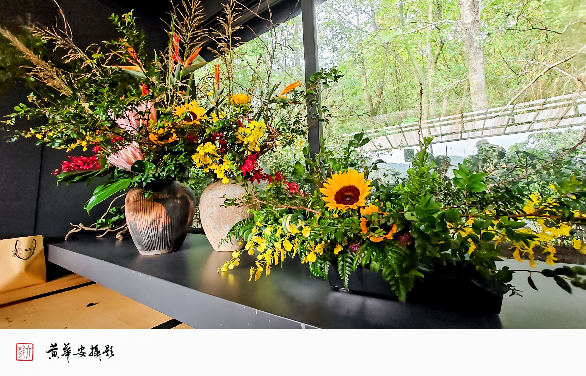 花道作品以秋色為題,黃花與紅葉相映成趣,盛放於光影流轉之間。(圖/記者黃華安攝)
