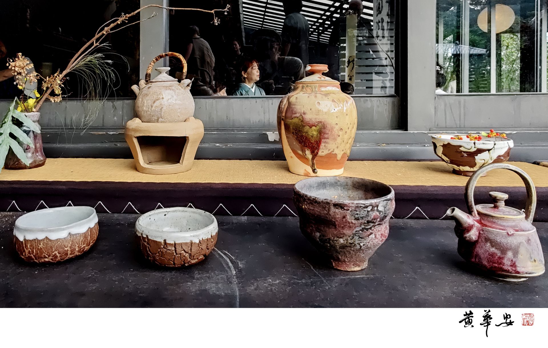 陶藝作品陳列於席間,火痕與土色交織,展現手作之美與修心之道。(圖/記者黃華安攝)