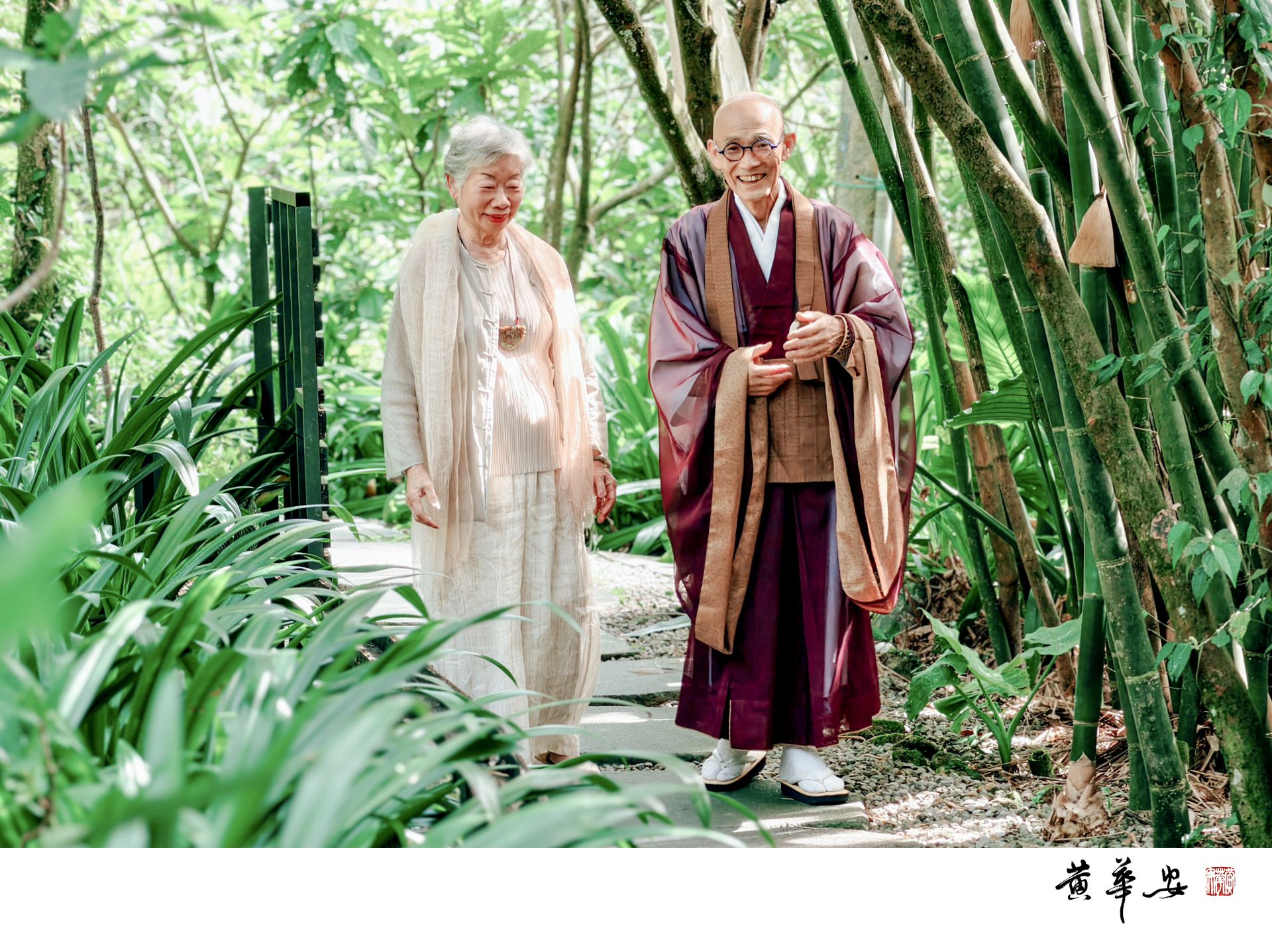 國際禪藝文化交流會活動由陳國寧老師與日本廣島西光禪寺住持檀上宗謙禪師共同策畫,二人緩步於竹林小徑,綠蔭搖曳,笑容中映出修行的平和與柔光,展現台日文化交流之深厚情誼。(圖/記者黃華安攝)