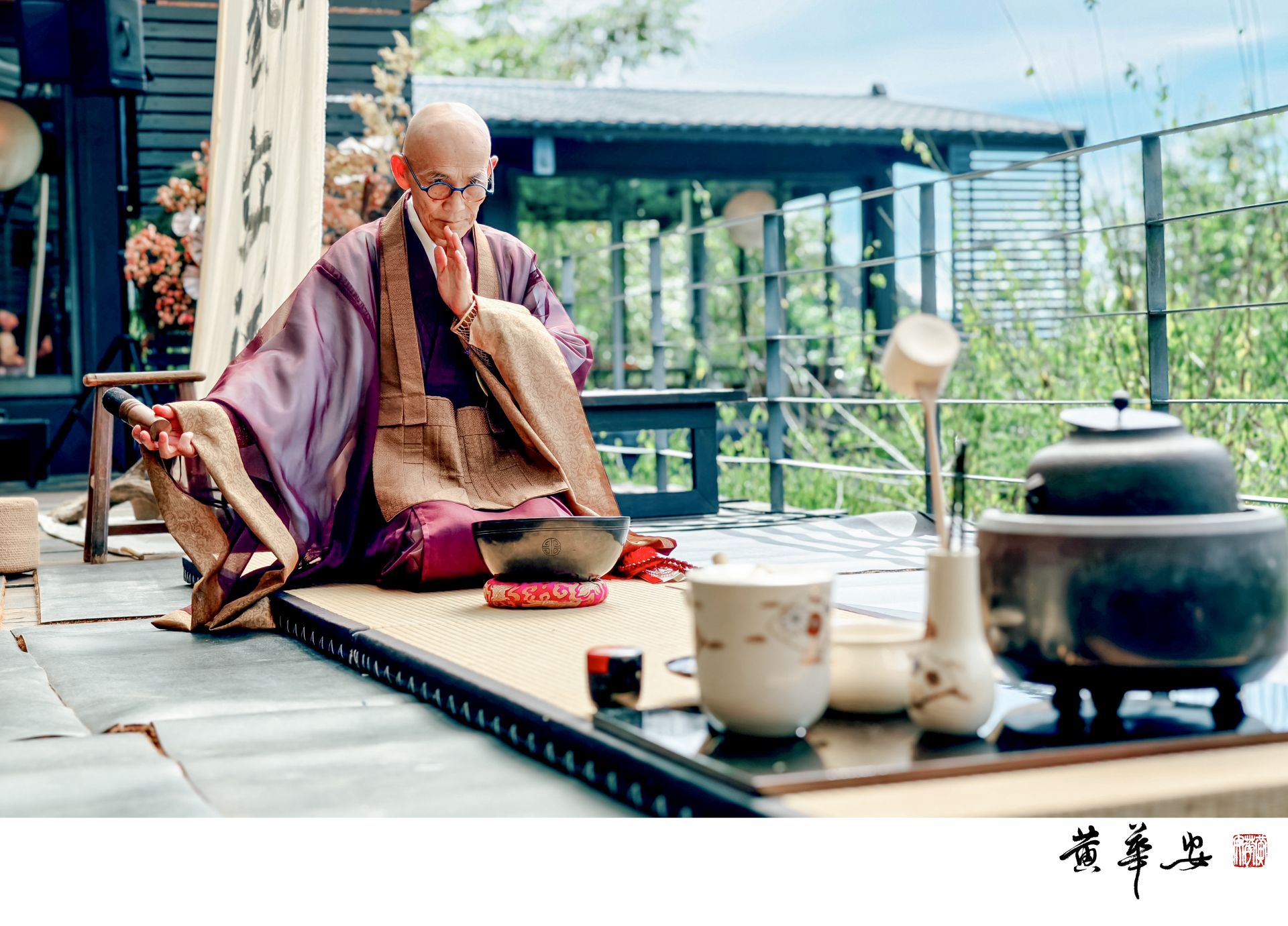 檀上宗謙禪師於茶席前誦經祈福,氣息沉穩,聲音如山風穿林,令人心靜如水。(圖/記者黃華安攝)