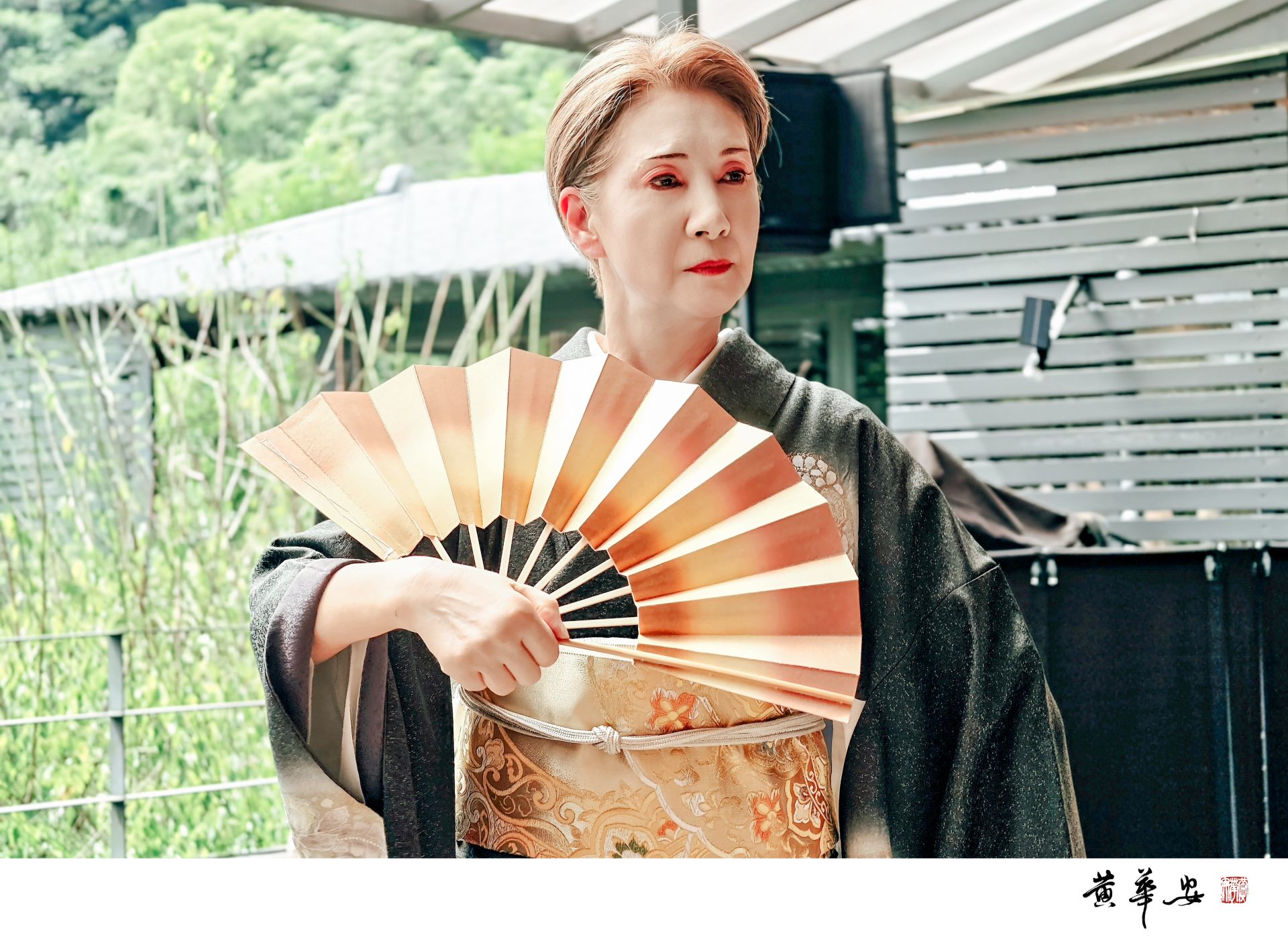 日本藝術家藤蔭萬伊都演出舞踊,舞藝精湛,執扇而立,神情安定,扇影流光間綻放靜謐之美。(圖/記者黃華安攝)