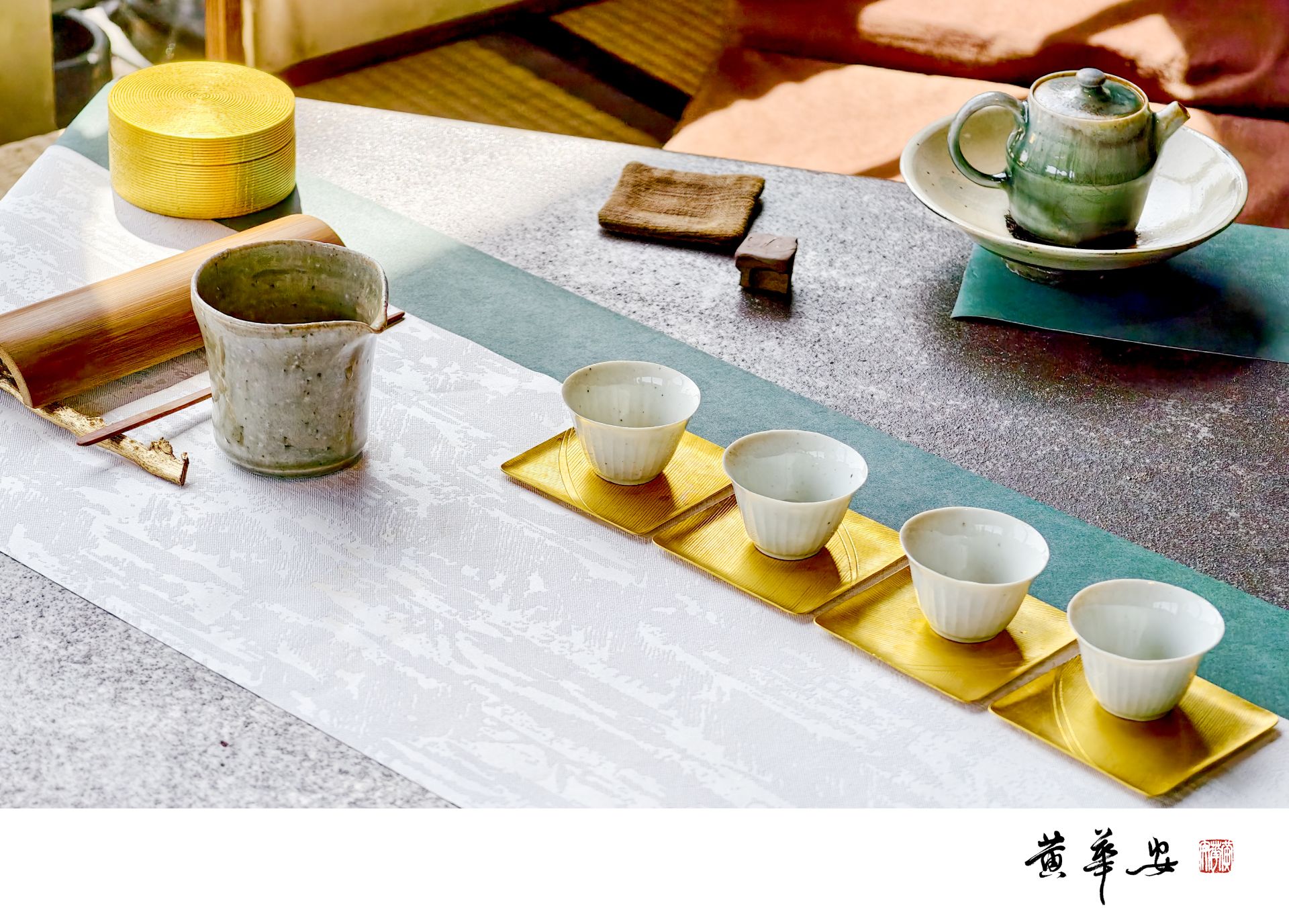 茶席器具陳列於案,金、綠、土色相間,簡約中見雅致之心。(圖/記者黃華安攝)