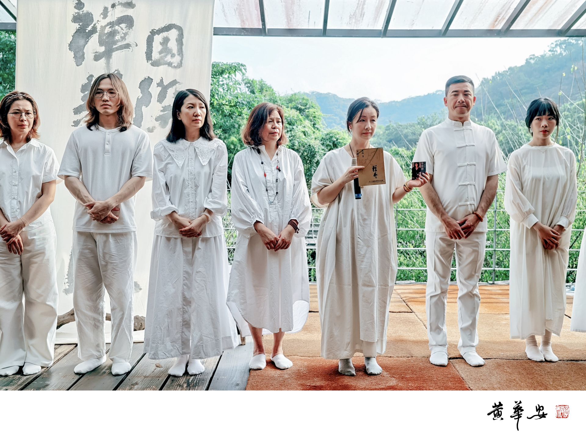 身著素白的茶藝家林筱如介紹茶道美學,弟子列隊於「禪藝」帷幕前,神情專注,氣息靜定如水。(圖/記者黃華安攝)