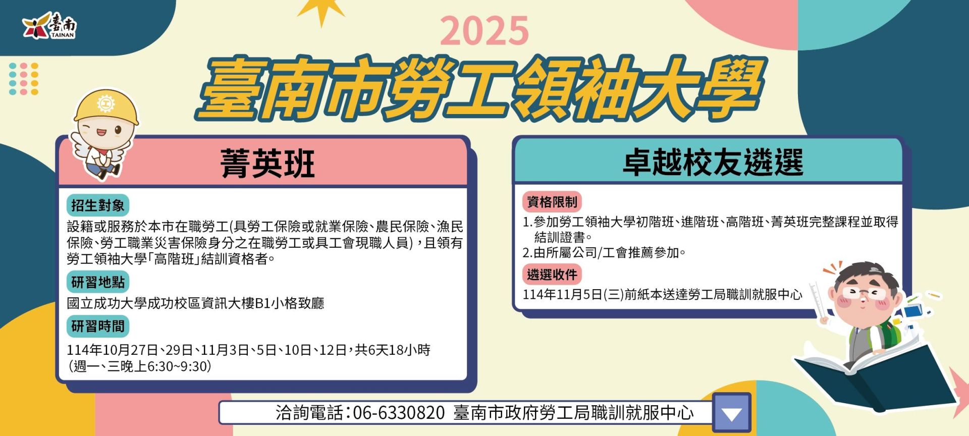 臺南市政府勞工局為落實市長黃偉哲「希望家園」施政願景,協助在職勞工持續精進專業能力,持續與國立成功大學合作辦理勞工領袖大學階梯式課程,今(114)年菁英班將於10月27日在成功大學成功校區的小格致廳開課,歡迎符合資格的勞工朋友踴躍報名參加,洽詢電話(06)6330820。