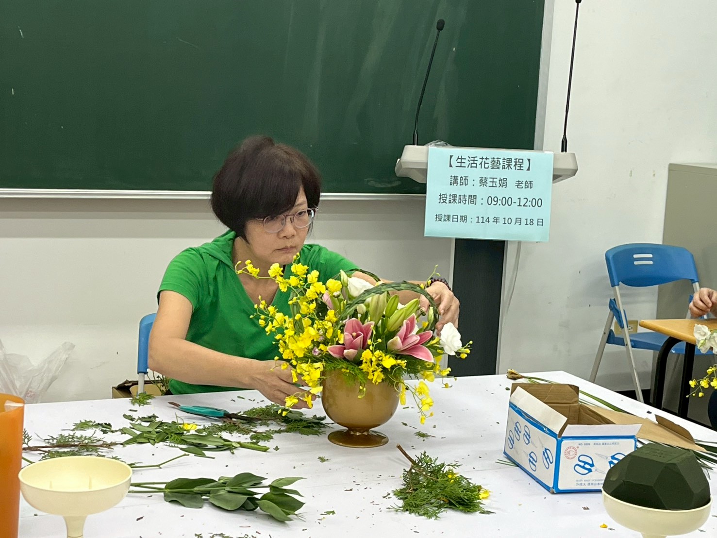 蔡玉娟老師除為艾華植藝工作室創辦人外,亦為財團法人中華花藝研究推廣基金會雲嘉南地區指定教室專業講師,長年致力於花藝推廣與教學,經驗豐富、熱忱十足。她在課堂中指出,隨著社會與經濟發展日益成熟,民眾對美感生活的需求也逐漸提升。學習花藝不僅能紓解生活壓力、增添日常樂趣,還能促進同好交流。課後將親手完成的作品妝點居家環境,不僅讓自己心情愉悅,也能與家人共享這份美好。