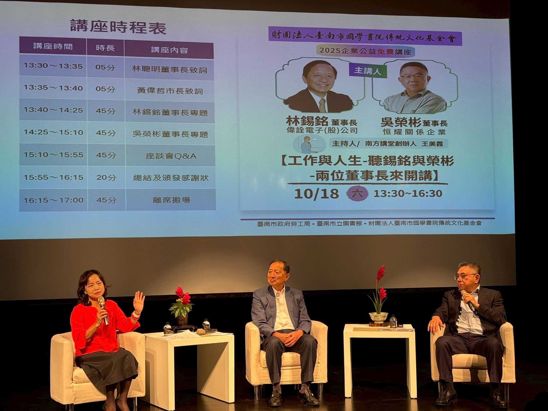 這次講座邀請偉詮電子股份有限公司林錫銘董事長與恒耀工業股份有限公司吳榮彬董事長同台對談,透過南方講堂創辦人王美霞老師以深入淺出的提問,引導兩位講者暢談工作觀與人生哲理,並強調學習與自我成長的重要性,同時分享他們多年來在企業經營、團隊帶領及面對職涯挑戰的寶貴經驗與人生智慧。兩位董事長以親身經驗分享如何面對職涯中的轉折與挑戰,鼓勵在場民眾要保持熱情、勇於嘗試。而講者們幽默、有溫度的分享,贏得聽眾熱烈掌聲,許多參與者表示,這場對談不僅帶來實用的職場啟發,更讓他們重新思考工作的意義與價值。