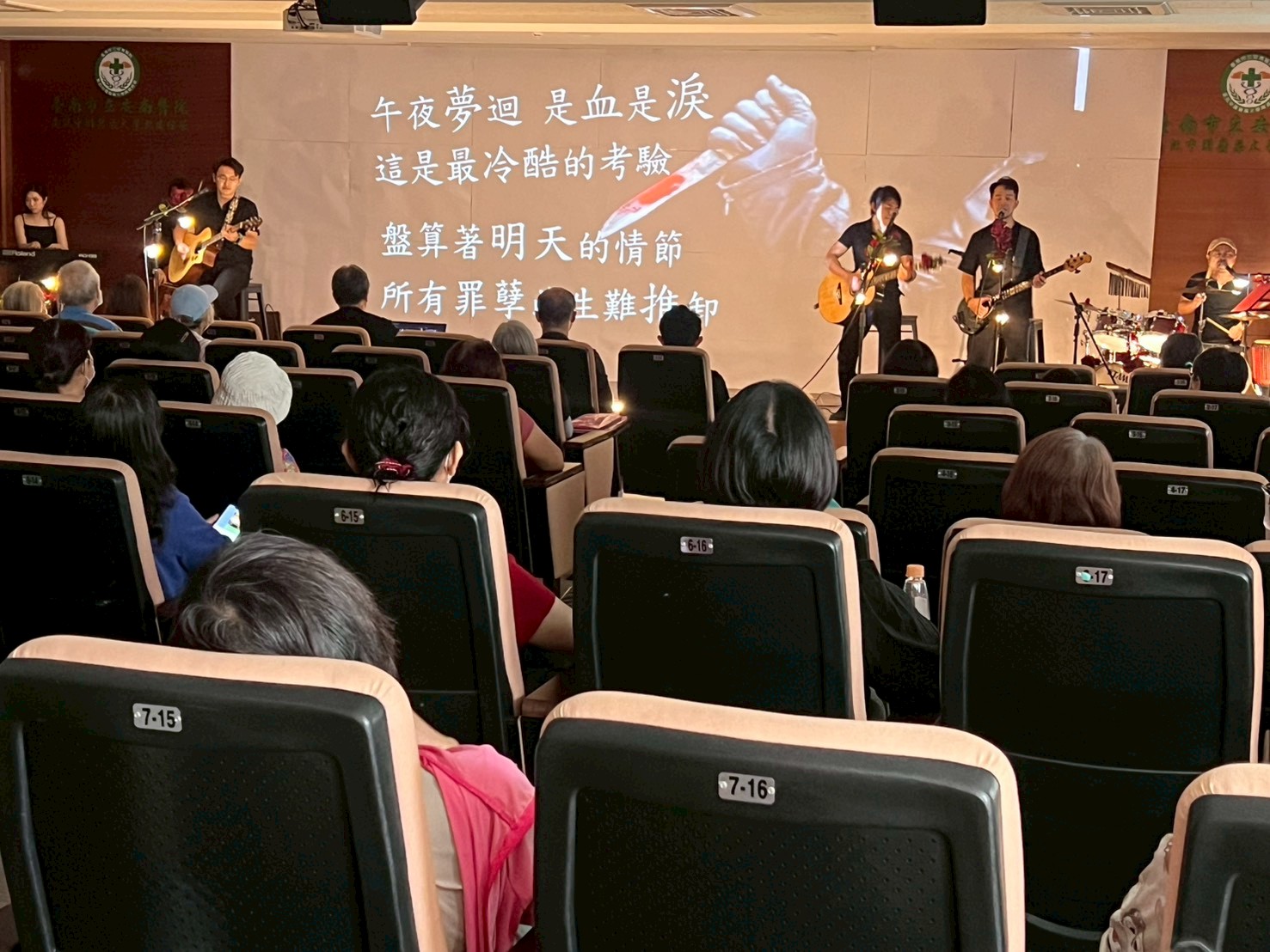 玫瑰墓樂團18日到台南安南醫院,以音樂、歌聲來為癌友來一場生命音樂饗宴,讓這些朋友的心靈更加健康。玫瑰墓樂團已超過500場的生命音樂講座,足跡遍及各級院校、扶輪社、獅子會,慈善會、宗教、商會、軍方等團體,對民眾、學生的啟迪和鼓勵造成前所未有的轟動及影響。