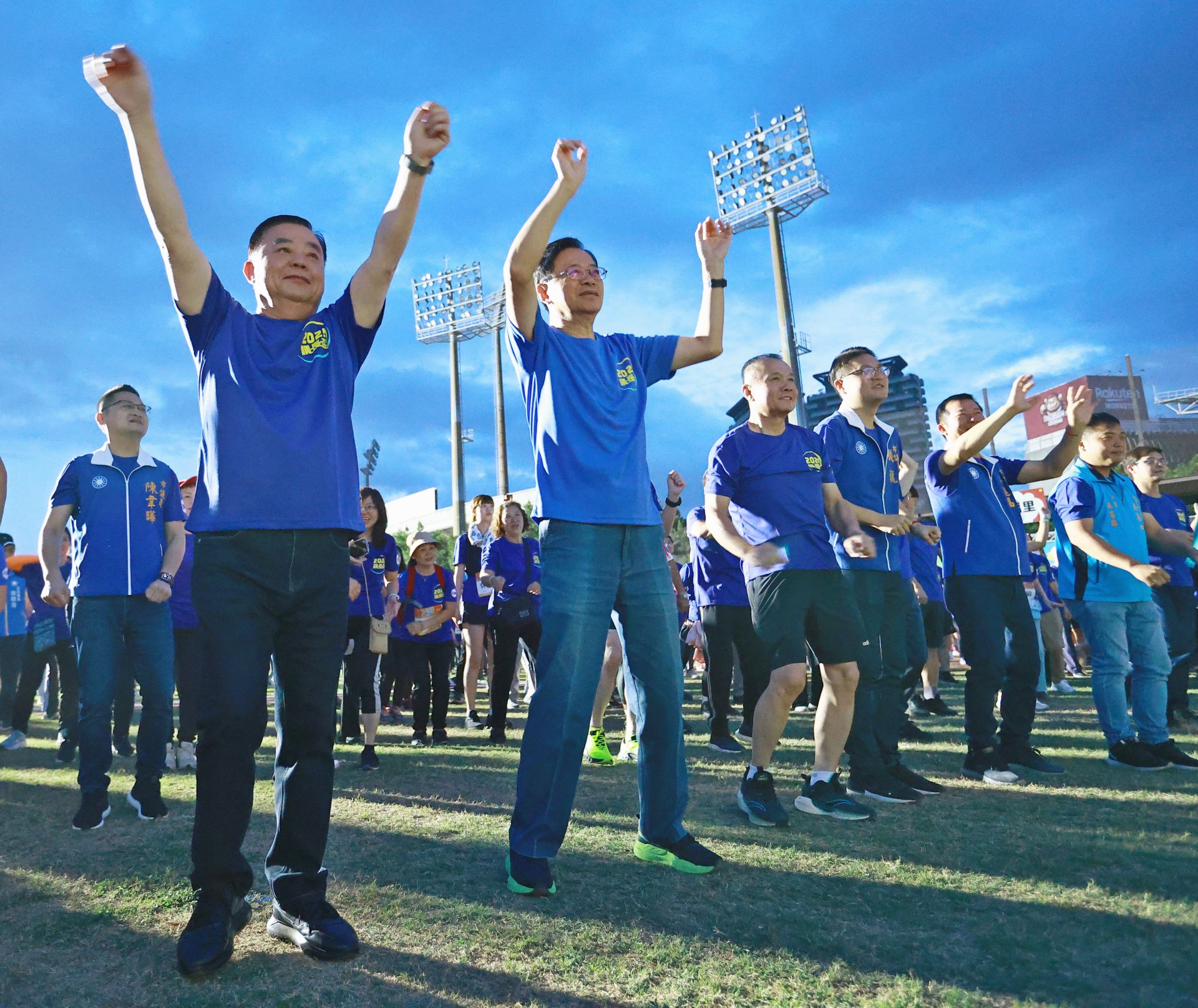 邱奕勝議長(左一)、張善政市長(左二)與所有參加路跑市民一起做暖身操。圖/議會提供