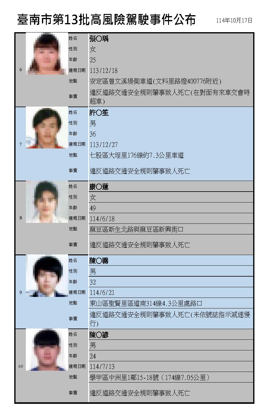 為提升交通安全友善空間,台南市制定高風險駕駛事件資訊公開作業原則,透過主動公開高風險駕駛事件資訊維護交通安全,今(21)日公布第13批高風險駕駛名單共11人,其中有3人涉嫌肇事逃逸致人死傷的駕駛人,交通局呼籲駕駛人除要避免高風險駕駛行為,也要保持防禦駕駛的觀念,才能確保行車用路安全。