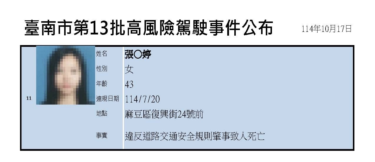 台南市政府交通局表示,台南市高風險駕駛事件資訊公開作業原則於112年8月11日公告施行,公告對象係就汽車駕駛人違反道路交通管理處罰條例因而肇事致人重傷或死亡者,或有其他受社會矚目的交通違規事件;於裁決處分完成後,依照公開作業原則將相關資訊去識別化,公布在交通局網站「高風險駕駛事件公布專區」。