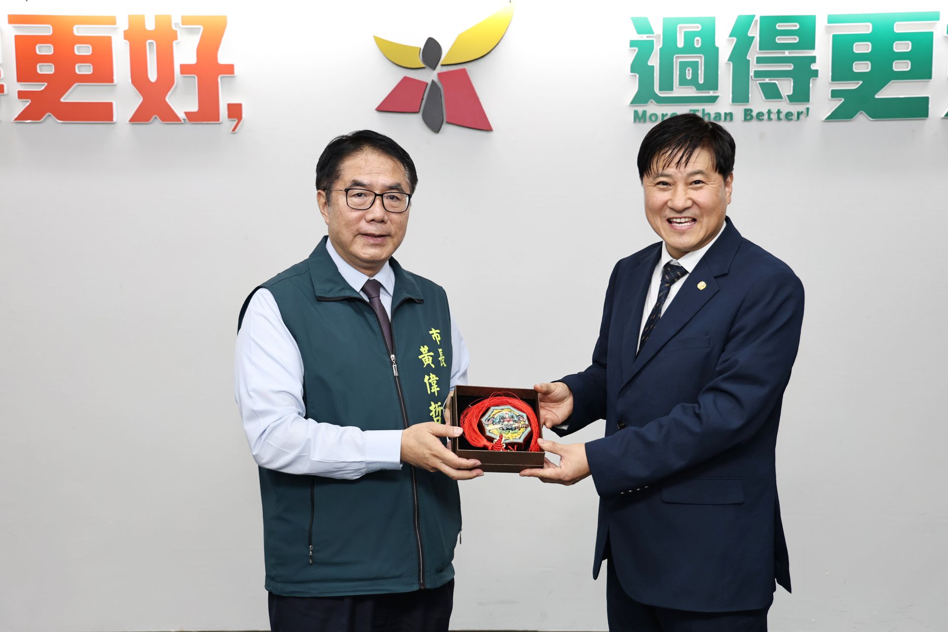 ▲黃偉哲市長致贈蔚山市會黃基赫會長台南劍獅。(新聞處 提供)
