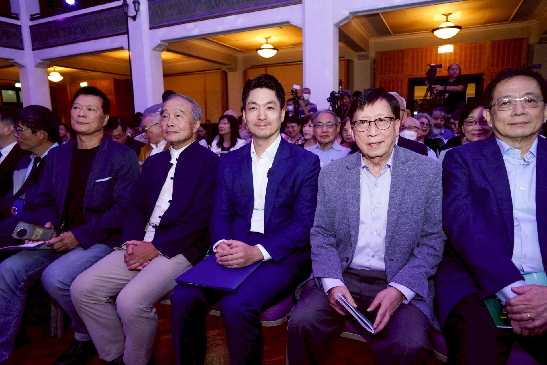 詩人與嘉賓接力登台朗誦,從古典詩到現代詩,聲聲傳情,現場氛圍莊嚴而溫柔。活動貴賓雲集,包括前臺大校長管中閔(右一)、前行政院長兼作家劉兆玄(右二)、以及文化局長兼作家蔡詩萍(右五)等人,共襄盛舉。(圖/臺北市政府提供)