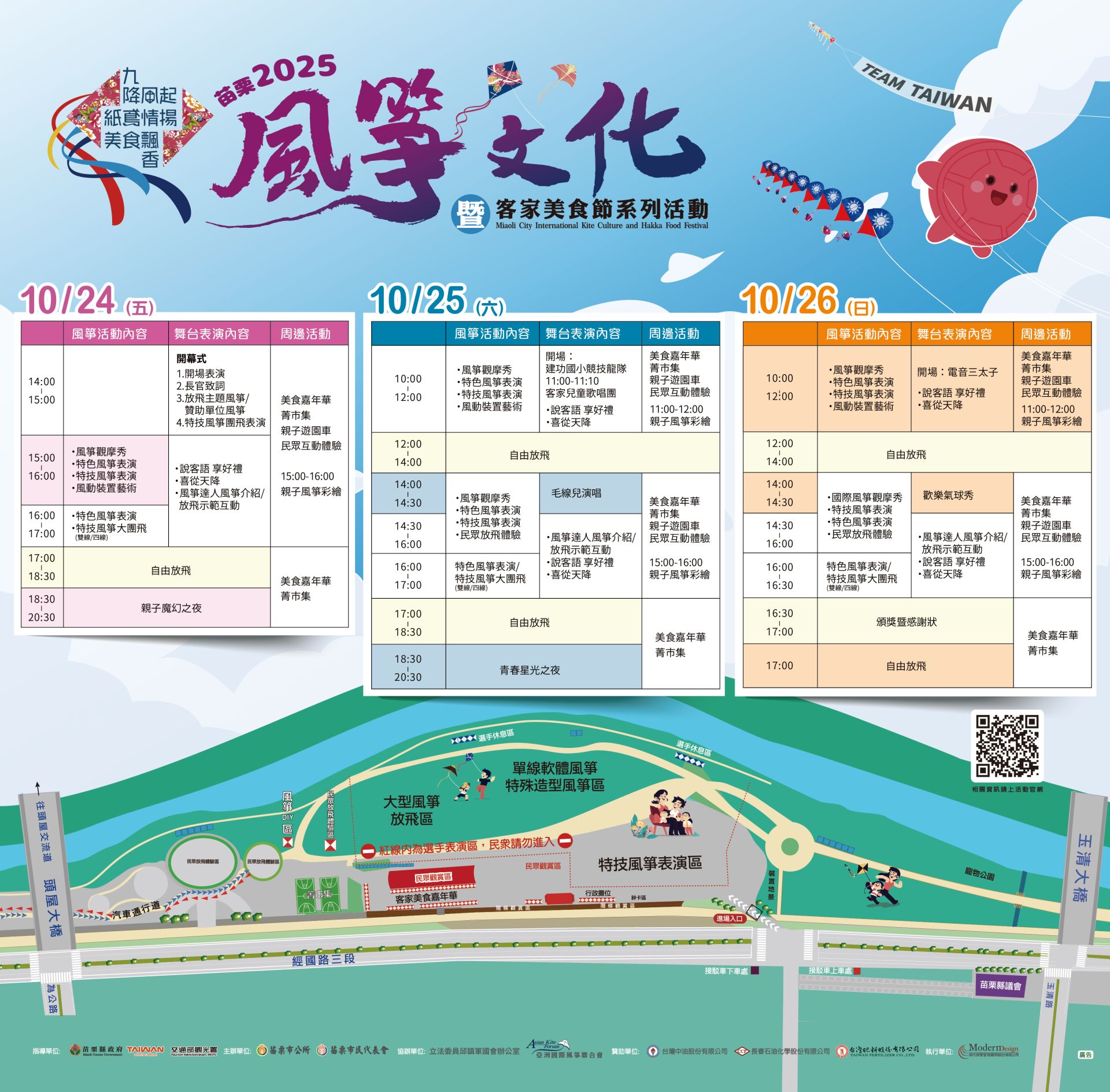 余文忠市長表示:「紅粄象徵幸福,國旗代表榮耀,而TEAM TAIWAN展現團結,三者在天空交織飛舞,就是苗栗最美的風景。」