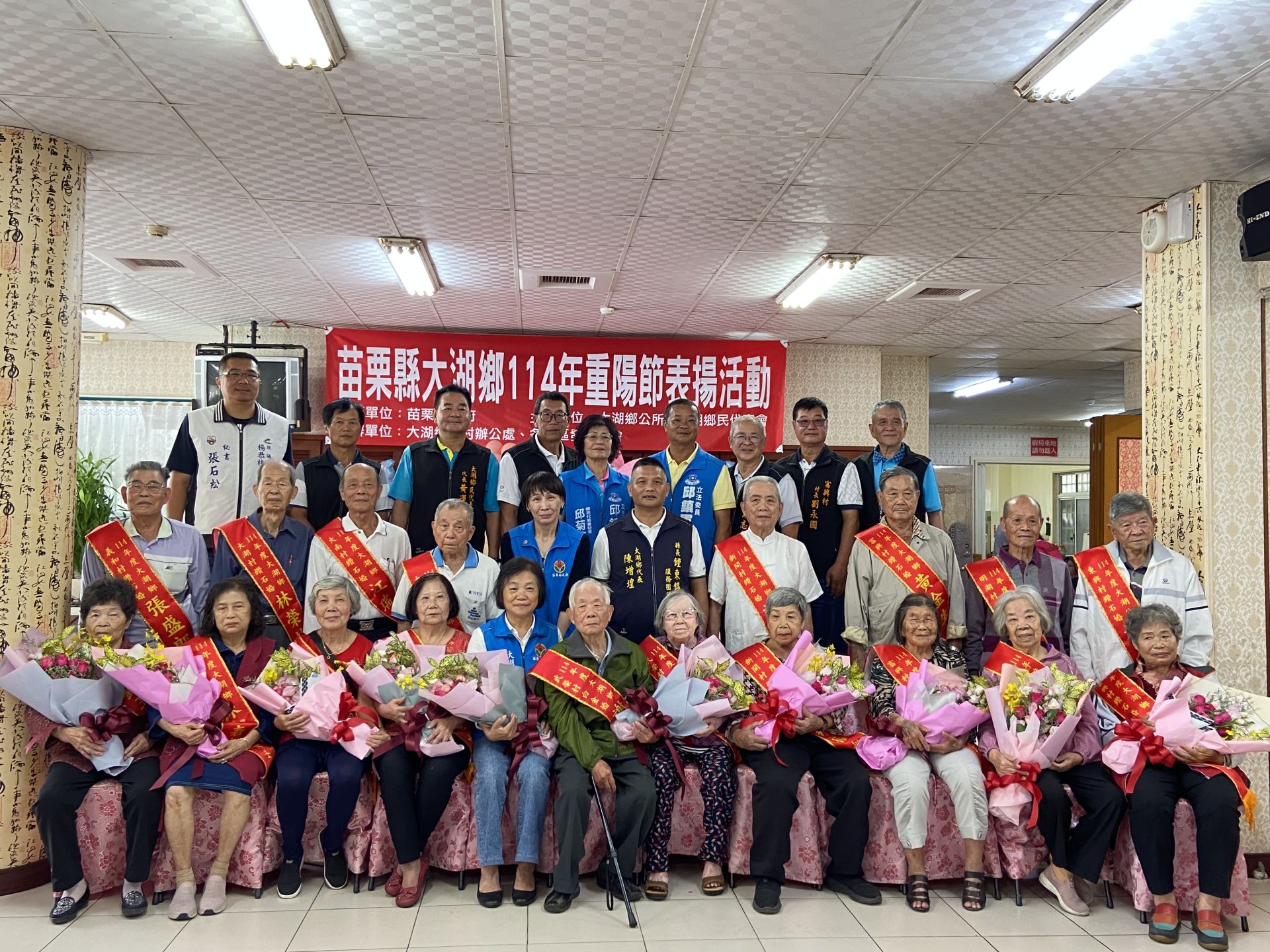 大湖鄉公所今(24)日於南北通餐廳舉辦「苗栗縣大湖鄉114年重陽節表揚活動」,其中敬老楷模10位、模範老人11位、鑽石婚楷模(結婚60年以上)8對,以及白金婚楷模(結婚70年以上)1對,共計39位地方楷模,場面溫馨隆重。