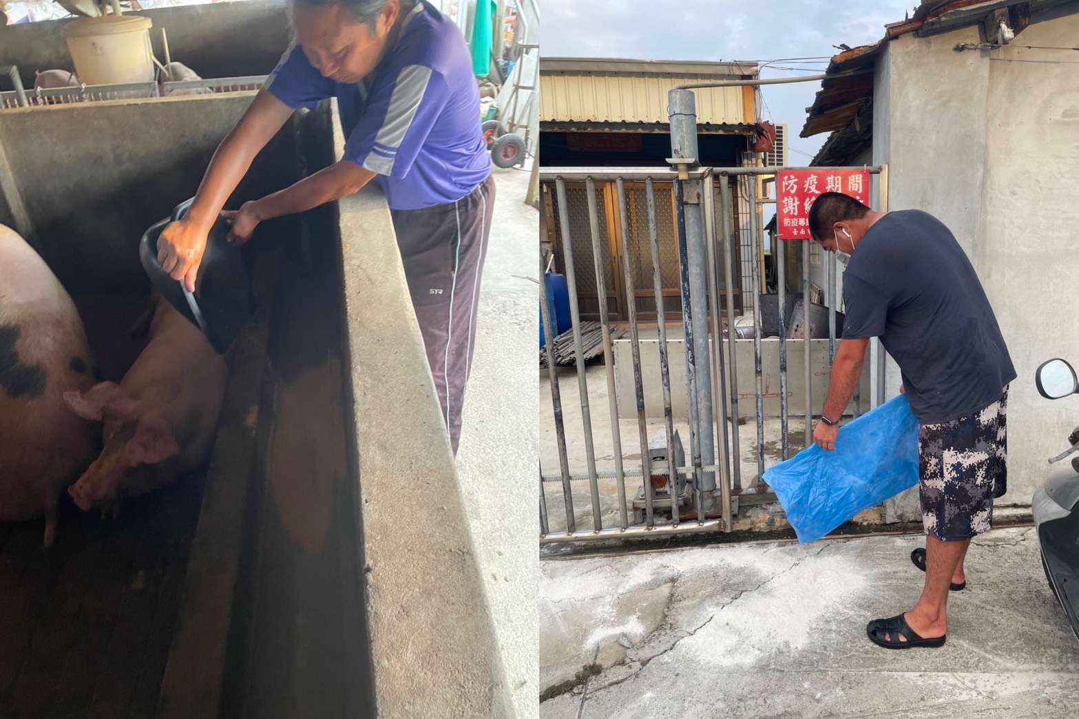 ▲(左圖)高風險豬場改飼料養豬、高風險場於門禁管制前灑生石灰加強警戒(右圖)。(圖/南市衛生局提供)
