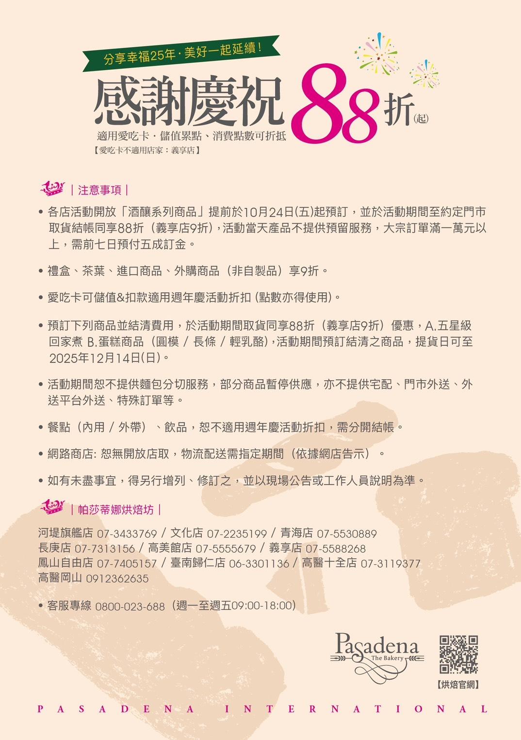【視傳媒記者吉雄世高雄報導】帕莎蒂娜烘焙坊成立25年,推出週年慶優惠4波接力活動。