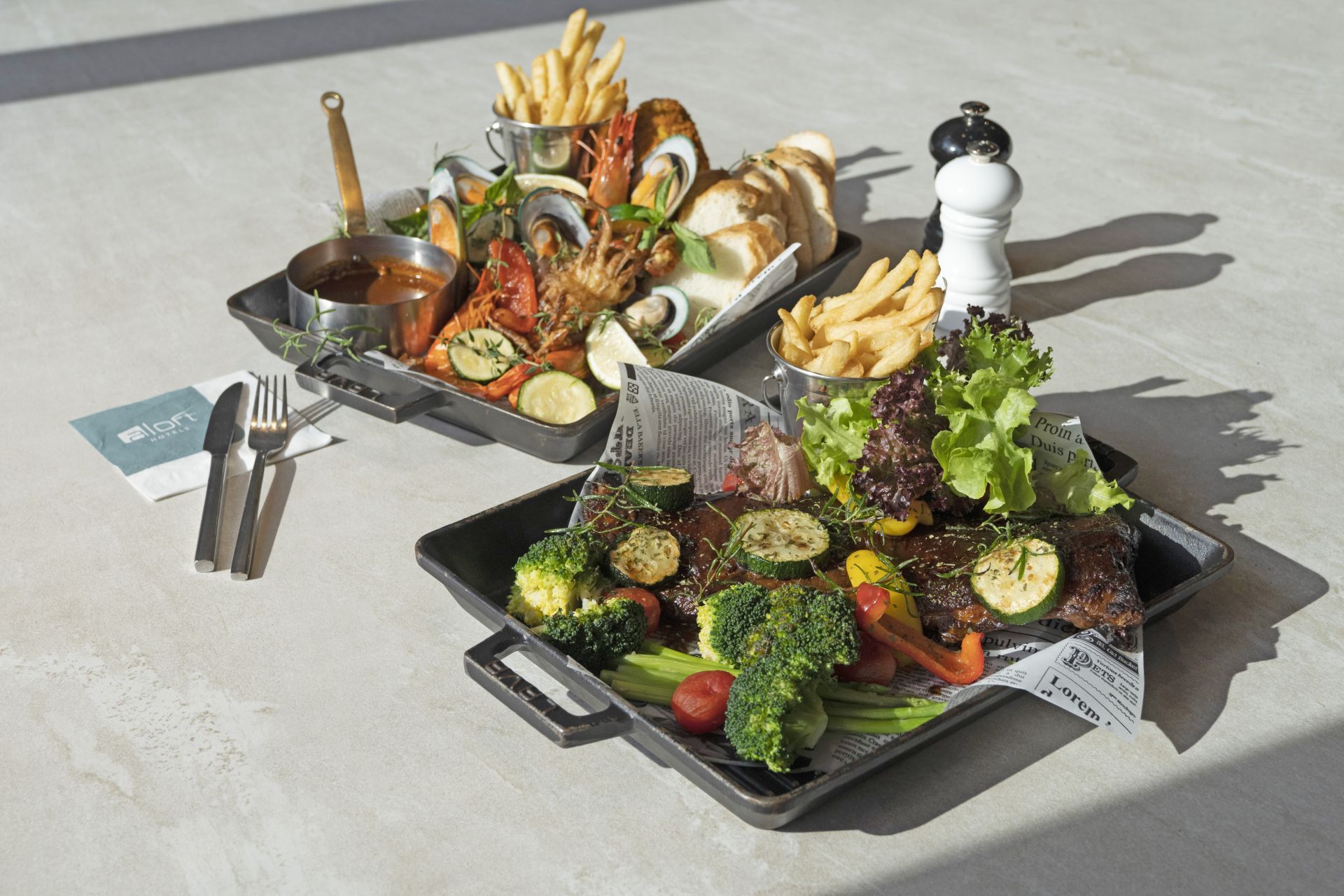 安平雅樂軒酒店最具特色的招牌菜蒜炒海鮮拼盤,升級進化為「拿坡里惡魔醬烤海鮮」, 2至4人設計的共享海鮮盤,集結酥炸軟殼蟹、淡菜、大蝦、中卷,與取得台江國家公園「黑皮牌」認證的友善養殖龍膽石斑魚片、薯條,還有墨西哥風味的整根玉米,類似台南悶烤石頭玉米的做法,玉米外裹上厚厚一層由墨西哥番椒、甜椒、起司粉、奶油調製的粉末,香甜美味。而搭配海鮮盤的醬汁為「惡魔醬」,這是一種風味濃郁的紅色海鮮醬汁,義大利文稱作Diavolo,主廚使用迷迭香、蝦殼、蟹肉、蕃茄碎、白蘭地、中卷塊熬製2小時而成,微辣濃郁,凸顯海鮮鮮甜與層次感,售價每份$1,280。
