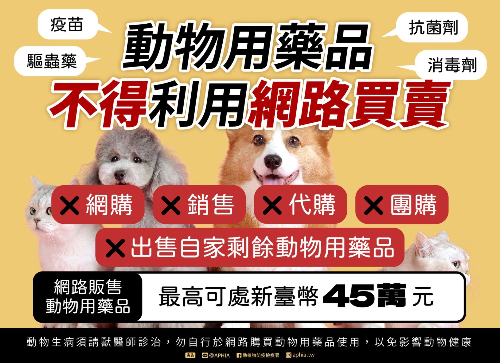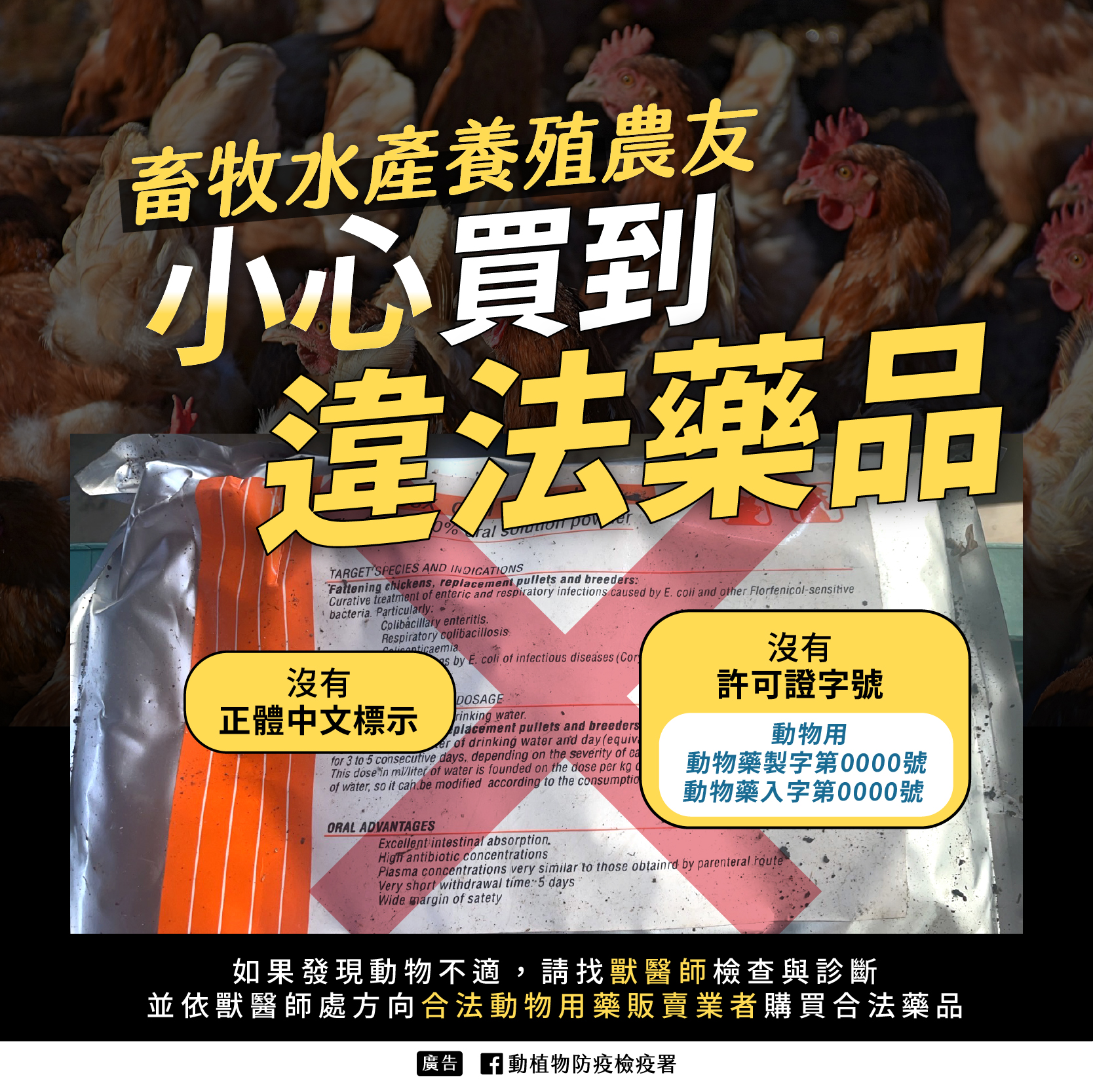 另為維護消費者權益與動物用藥安全,縣府並提醒:非動物用藥品不得標示或宣稱具有預防、治療動物疾病或促進、調節生理機能之效能,違者亦將依《動物用藥品管理法》第19條之1第3項規定查處。
