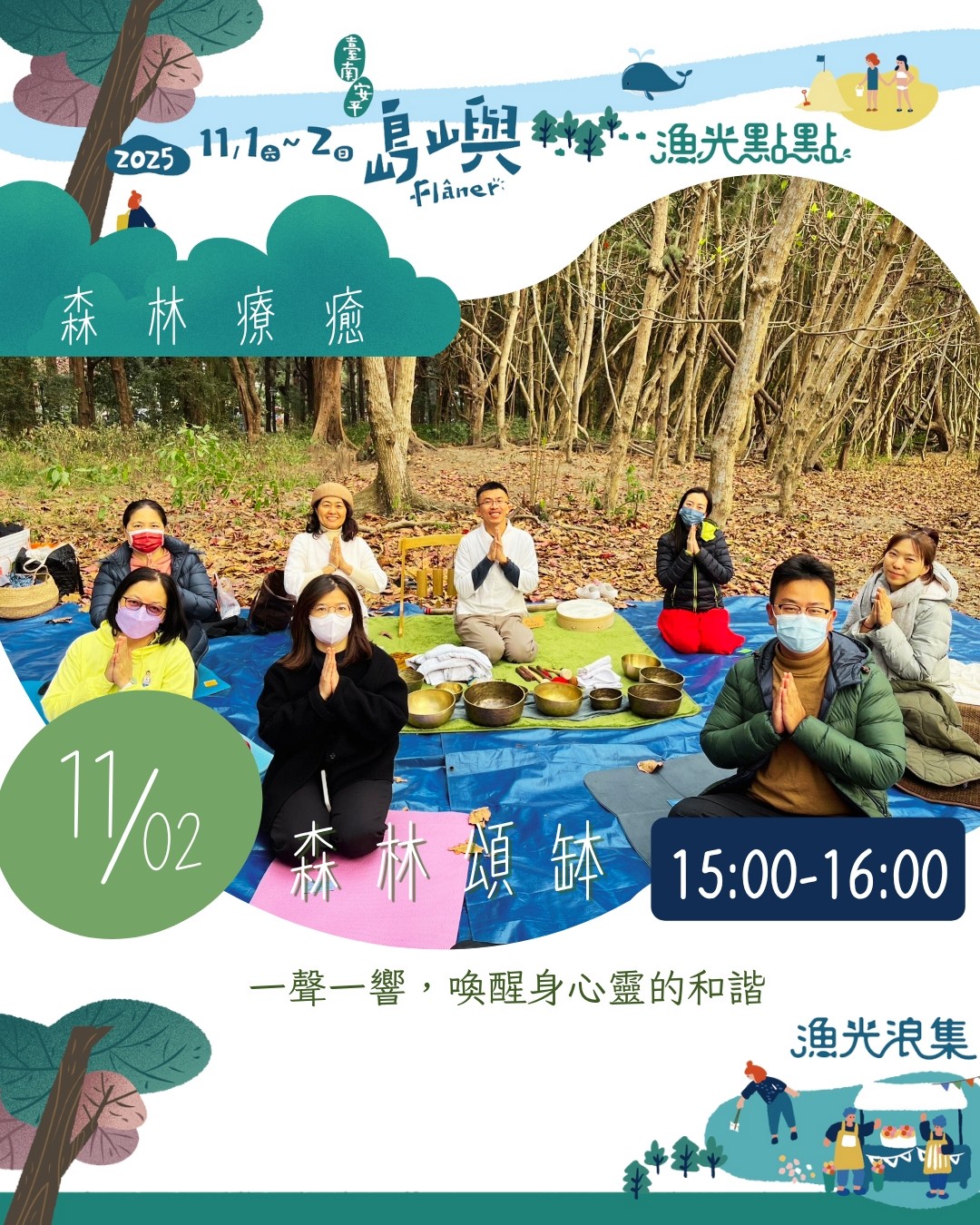邀請瑜珈及頌缽老師帶領參加者漫步林間,透過深呼吸、冥想及自我覺察,重新連結身體與自然節奏,在繁忙都市生活中重新找回內在的寧靜。並辦理法式富蚵餐桌,邀請民眾一同享用在漁光島鹹淡交融的海域孕育出的肥美蚵仔,在林間微光與海風交織中,結合三種不同文化調味風格,於大自然的餐桌上展開一場味覺與文化的對話。