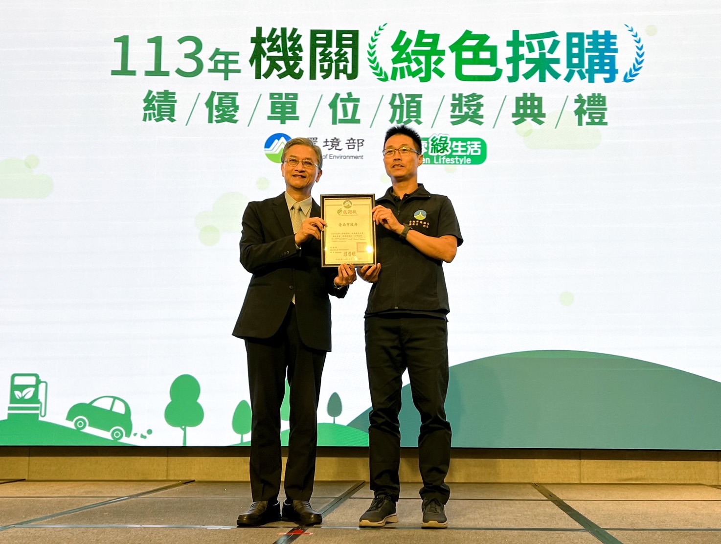 政府積極推動綠色採購與淨零綠生活政策,成果再獲肯定!在環境部113年度機關綠色採購評核中,臺南市政府以滿分100分榮獲「優等」評比,這已是市府連續第13年蟬聯全國優等殊榮。環境部10月28日假台南市銀級環保標章旅宿「臺南大員皇冠酒店」舉行績優單位表揚典禮,由環保局科長陳原禾代表受獎。