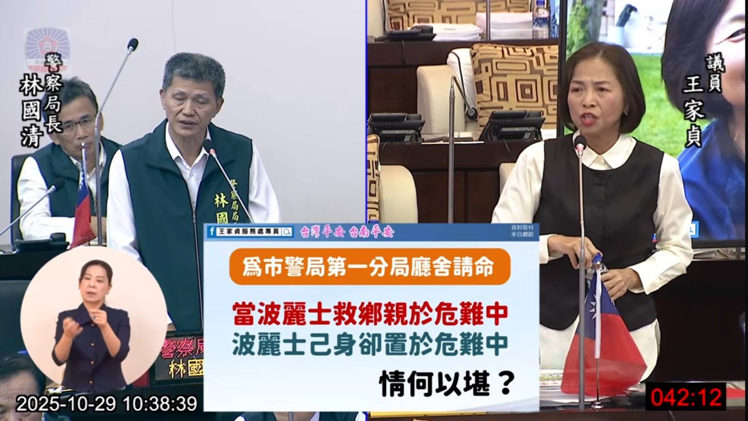 ▲市議員王家貞利用總質詢時間,為警察局請命,要求中央及地方政府興建新的警察分局。(記者黃雋淮 翻攝)