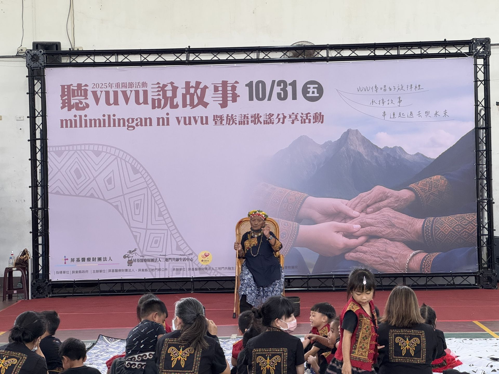 【視傳媒/記者范家豪/三地門報導】 結合重陽敬老精神,展現排灣族與魯凱族音樂、語言與文化的獨特魅力,屏基醫療財團法人三地門共融生活中心於10 月 31 日舉辦理「聽 vuvu 說故事~~~~~ milimilingan ni vuvu 暨族語歌謠分享活動」。透過歌謠表演及故事分享,不僅對長者表達致敬,重溫祖先的智慧,讓文化的火種在世代間延燒,更是一場跨世代、跨族群的文化傳承。