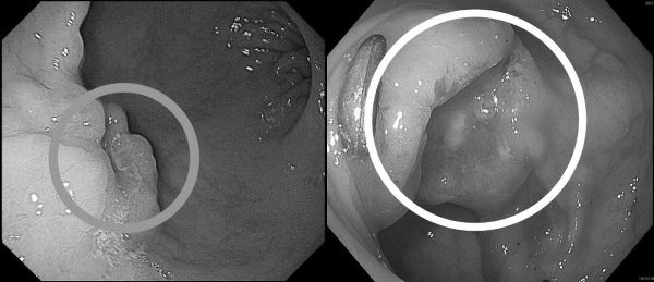 圖說二:病人接受詳細檢查,醫師在其胃部及乙狀結腸內均發現癌灶(圓圈處)。圖/高醫岡山醫院提供