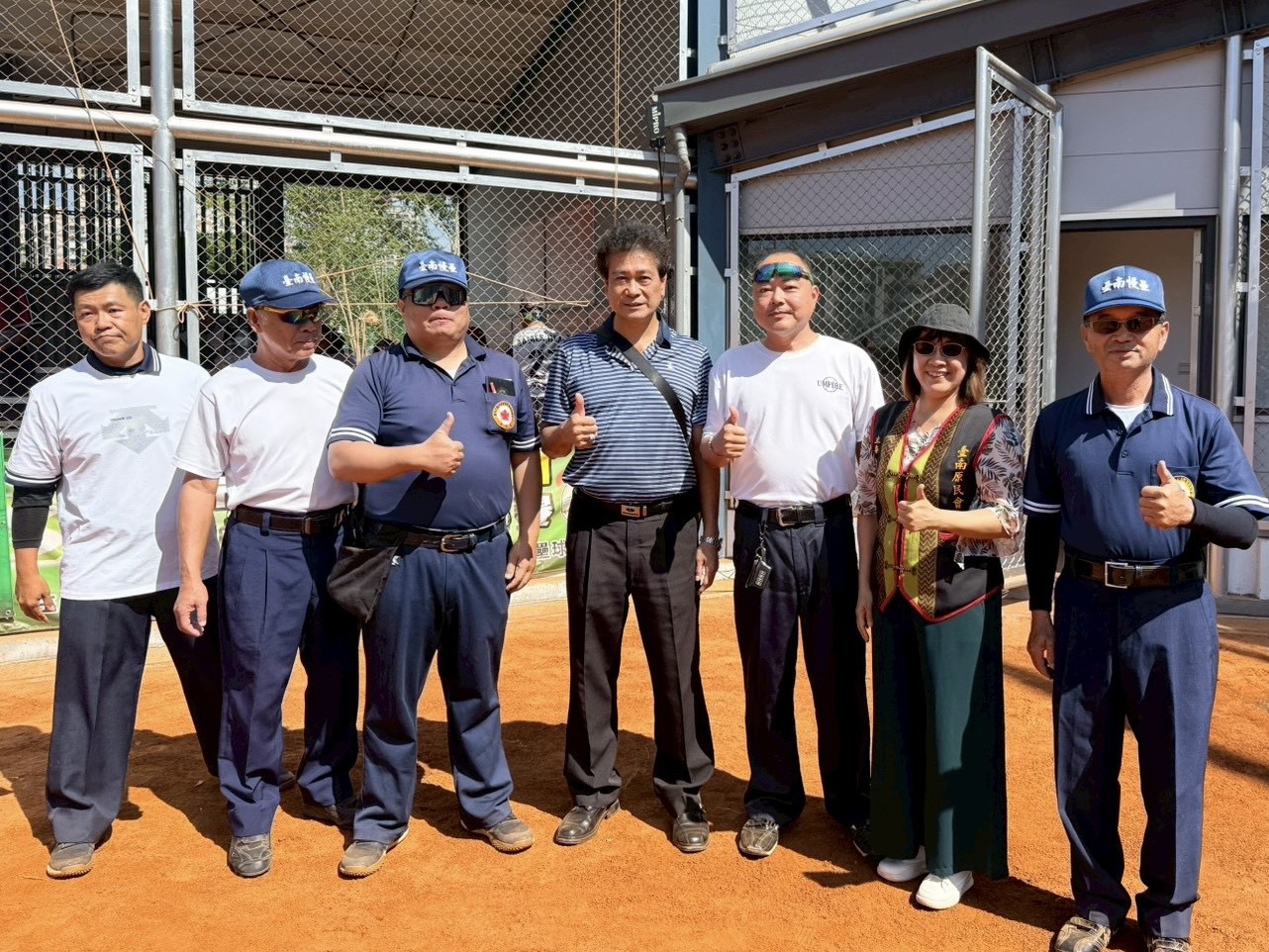 ▲114年札哈木盃全國原住民慢速壘球錦標賽 中央原民會陳義信副主委(中間)、臺南原民會主委白惠蘭Salau Kaljimuran (右二)、裁判長黃柏憲(右三)及裁判群合照。(原民會 提供)