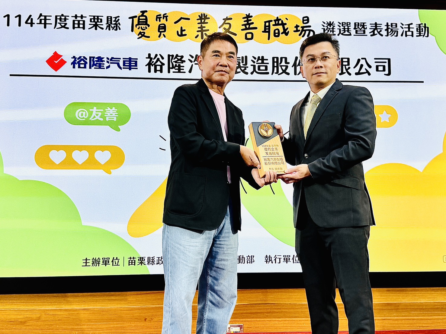 裕隆汽車榮獲苗栗縣優質企業友善職場獎,縣長鍾東錦頒獎予裕隆汽車吳世琳協理